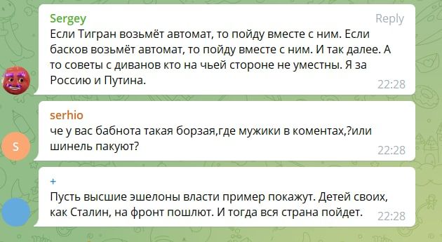 Прокомментировали и призыв идти добровольцами в военкомат – "Если тигран или басков возьмет автомат, то пойду с ними", "Пусть высшие эшелоны пример покажут. Как Сталин отправят своих детей на войну".