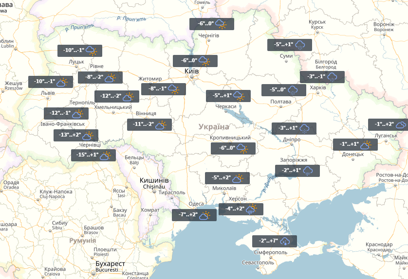 Во Львове ночью температура опустится до -5 °, а днем + 1 °. А в воскресенье ночью уже температура опустится до -11 °. На Львовщине будет холоднее: там синоптики обещают снижение температуры до -21 ° ночью и до -16 ° днем. В воскресенье без осадков, ночью -15 °, днем до -13 °.