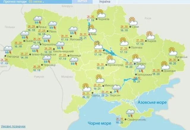 Так, днем 3 июля в западных, Житомирской и Винницкой областях грозовые дожди, местами сильные ливни. Также прогнозируют крупный град и шквалы 25-28 м/сек.