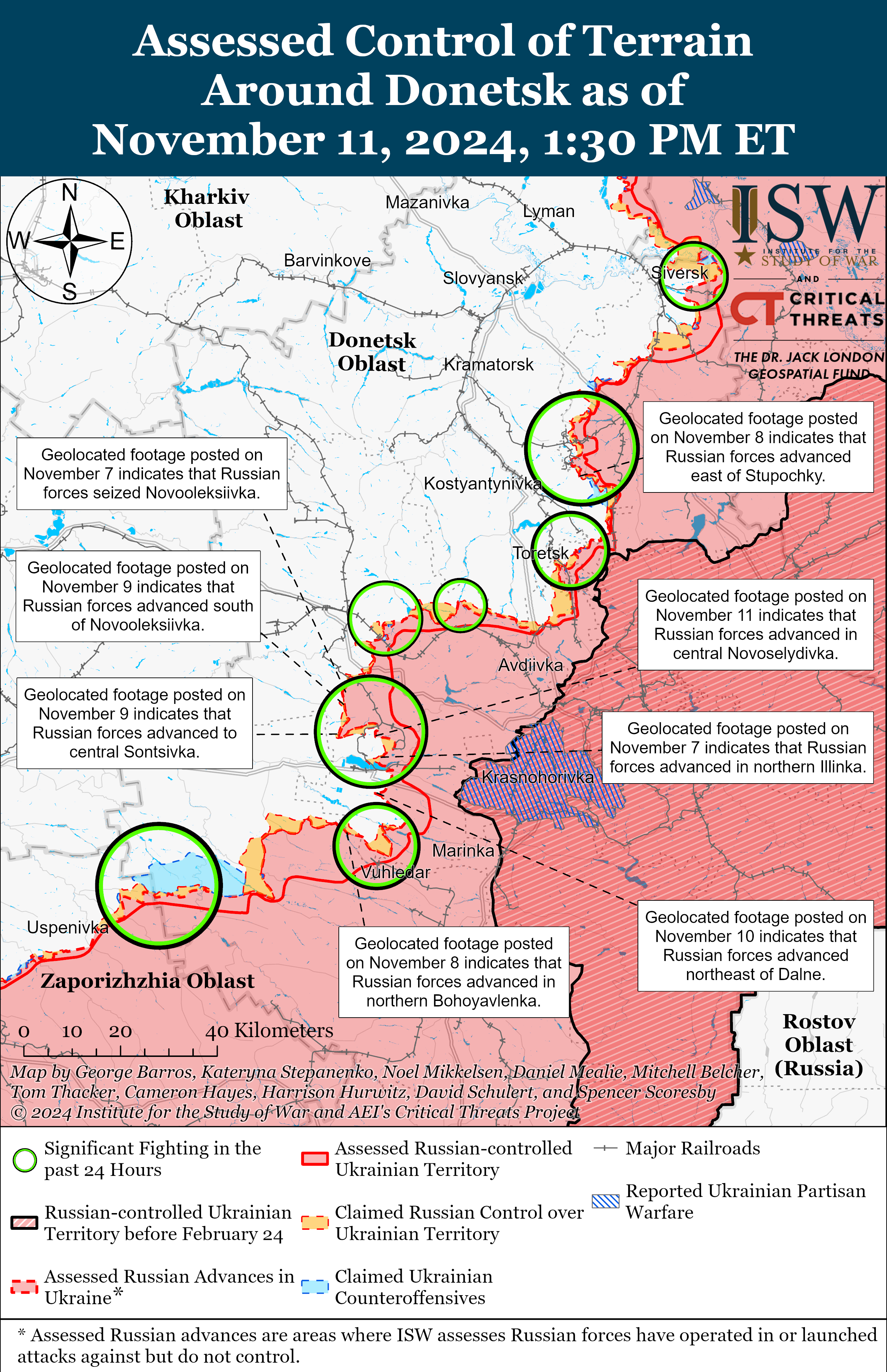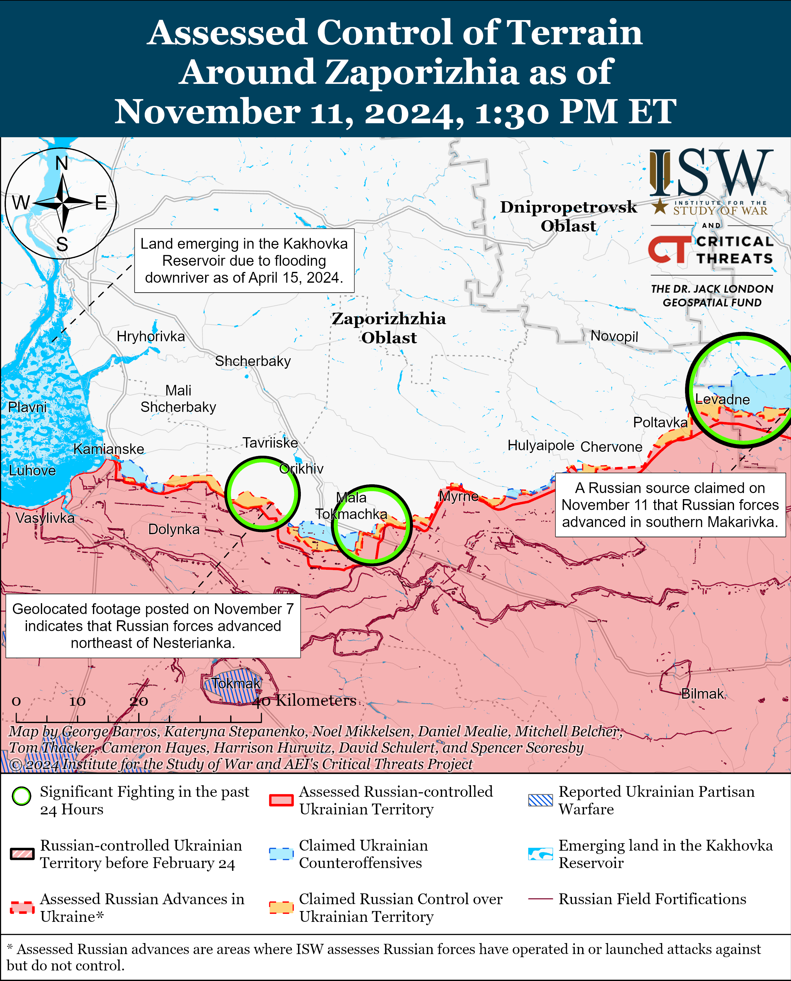 - 10 и 11 ноября российские войска продолжали наступление на западе Запорожской области вблизи Малой Токмачки, но никаких подтвержденных изменений на линии фронта не было.