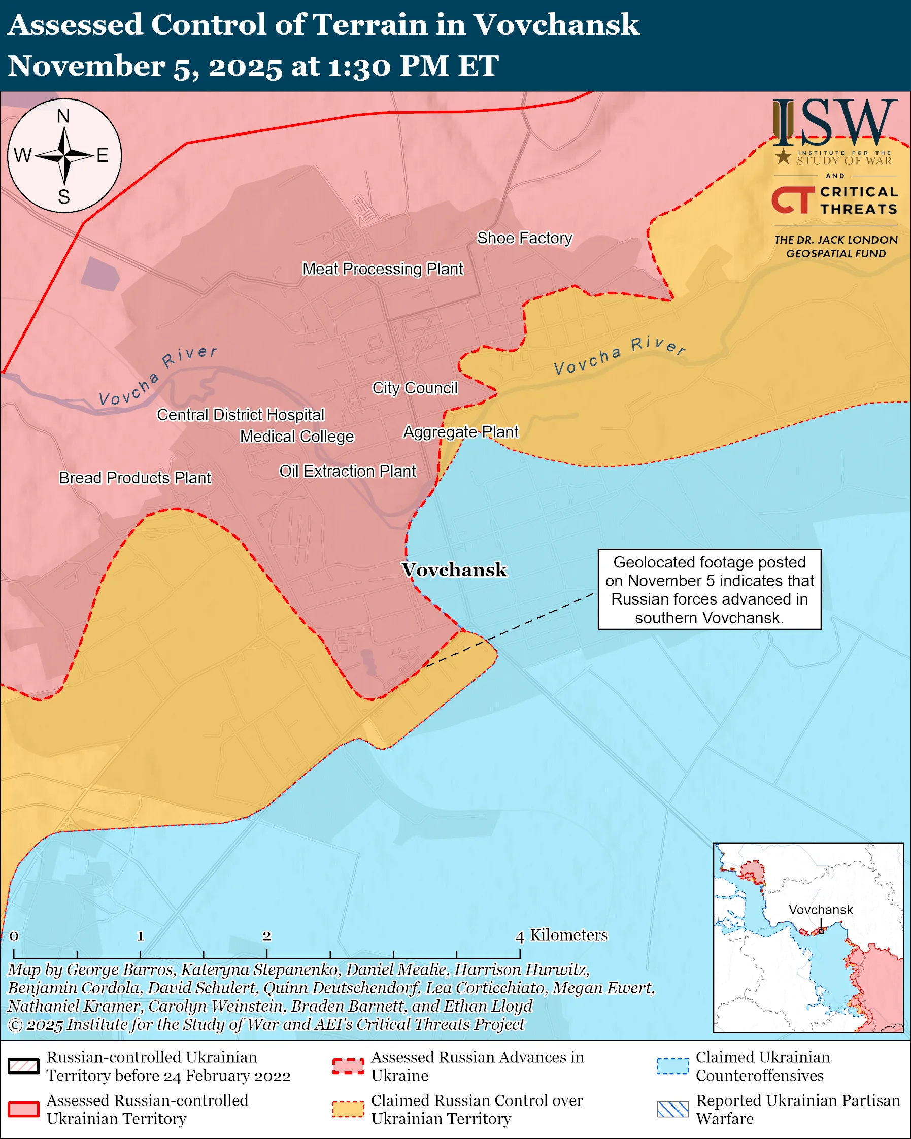 - Российские войска продолжили наступательные операции в направлении Великого Бурлука 5 ноября, но подтвержденных продвижений нет. Они атаковали вблизи Хатнего и Бологовки.