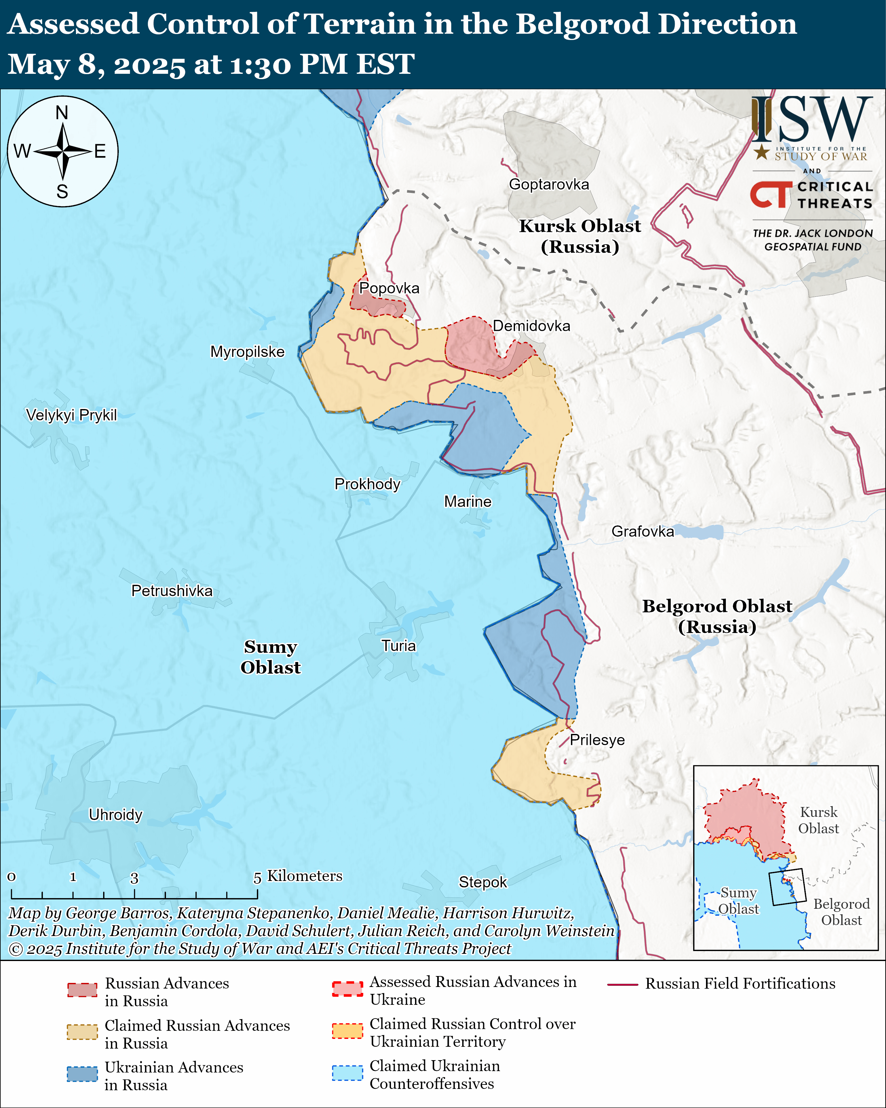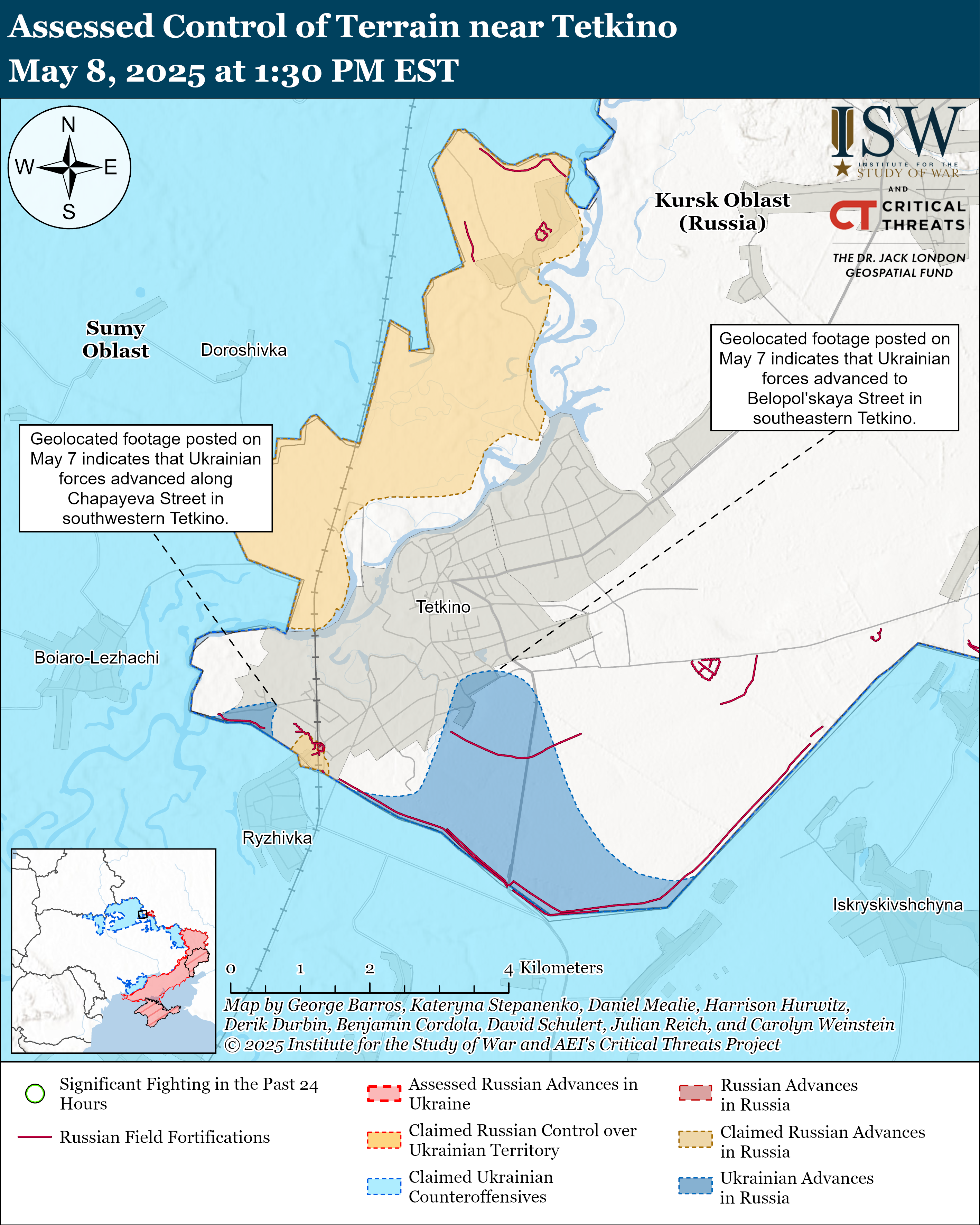 - Украинские и российские войска недавно имели продвижение в Курской области. Геолокационные кадры, опубликованные 7 мая, свидетельствуют о том, что ВСУ продвинулись вдоль улицы Чапаева в Теткино и вблизи, а Россия – к международной границе к югу от Олешни.