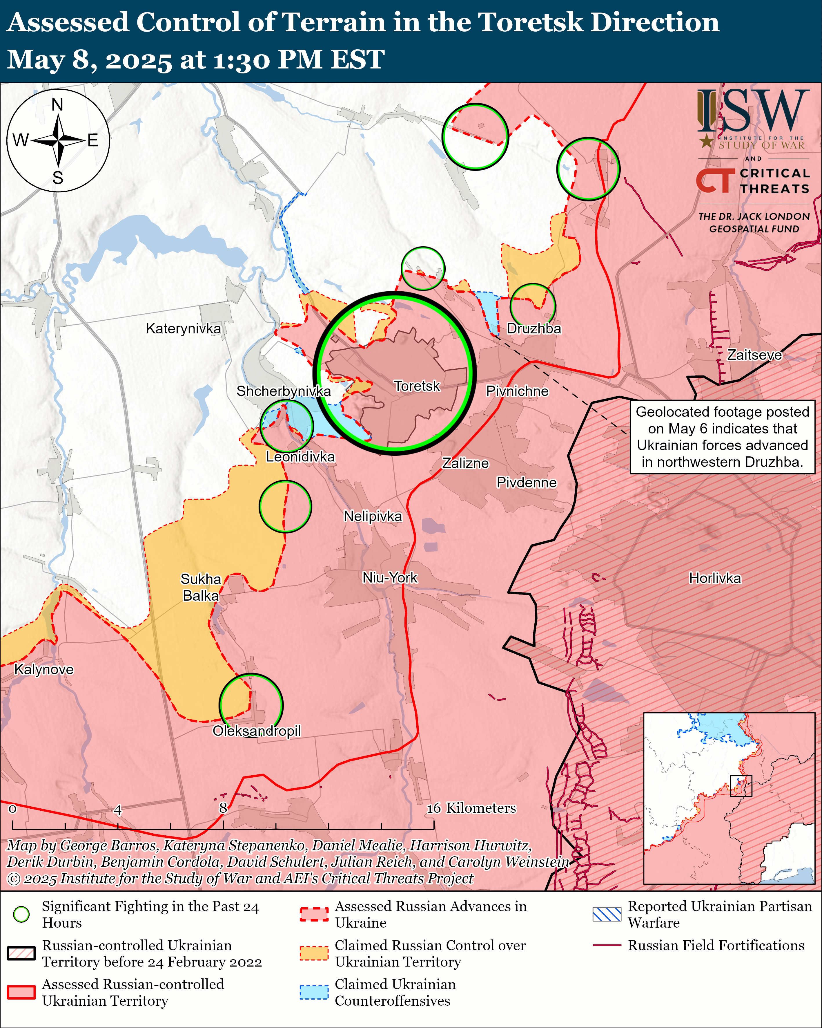 - Украинские и российские войска недавно продвинулись на Торецком направлении. Кадры за 6 – 7 мая свидетельствуют о том, что ВСУ имеют продвижение к улице Радгоспная на северо-западе Дружбы, а Россия – в южной части Новой Полтавки. Оккупанты также атаковали вблизи Торецка, Дилиевки, Щербиновки, Новой Полтавки, Малиновки, Елизаветовки, Крымского, Александрополя, а также в направлении Романовки.