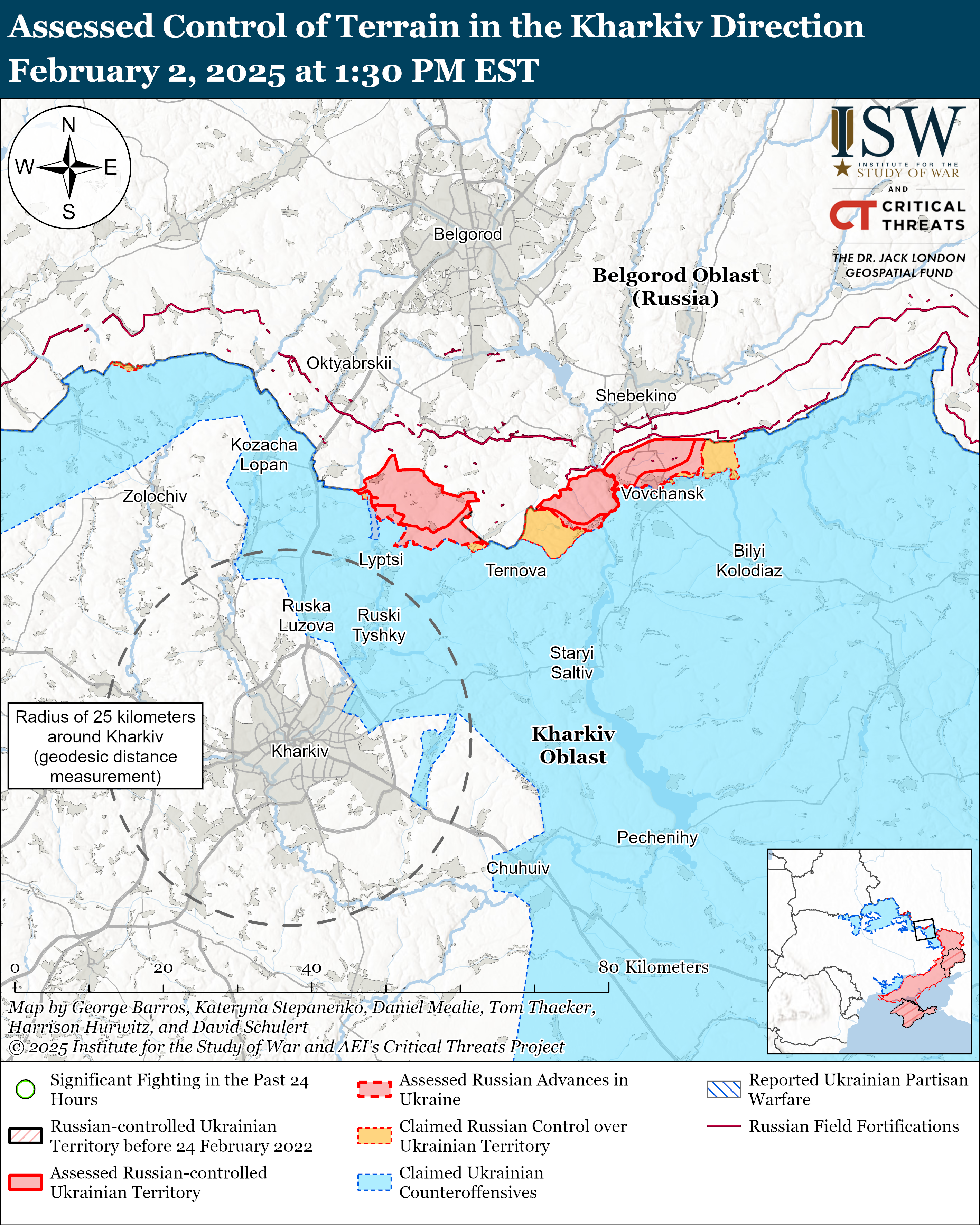 - Однако, российские войска продолжили наступление на Купянском направлении, но, к счастью, продвижений не имели. Они атаковали возле Купянска и вдоль границы вблизи Тополя, а также у Двуречной, Петропавловки, Песчаного, Глушковки и Степной Новоселовки 1 и 2 февраля.