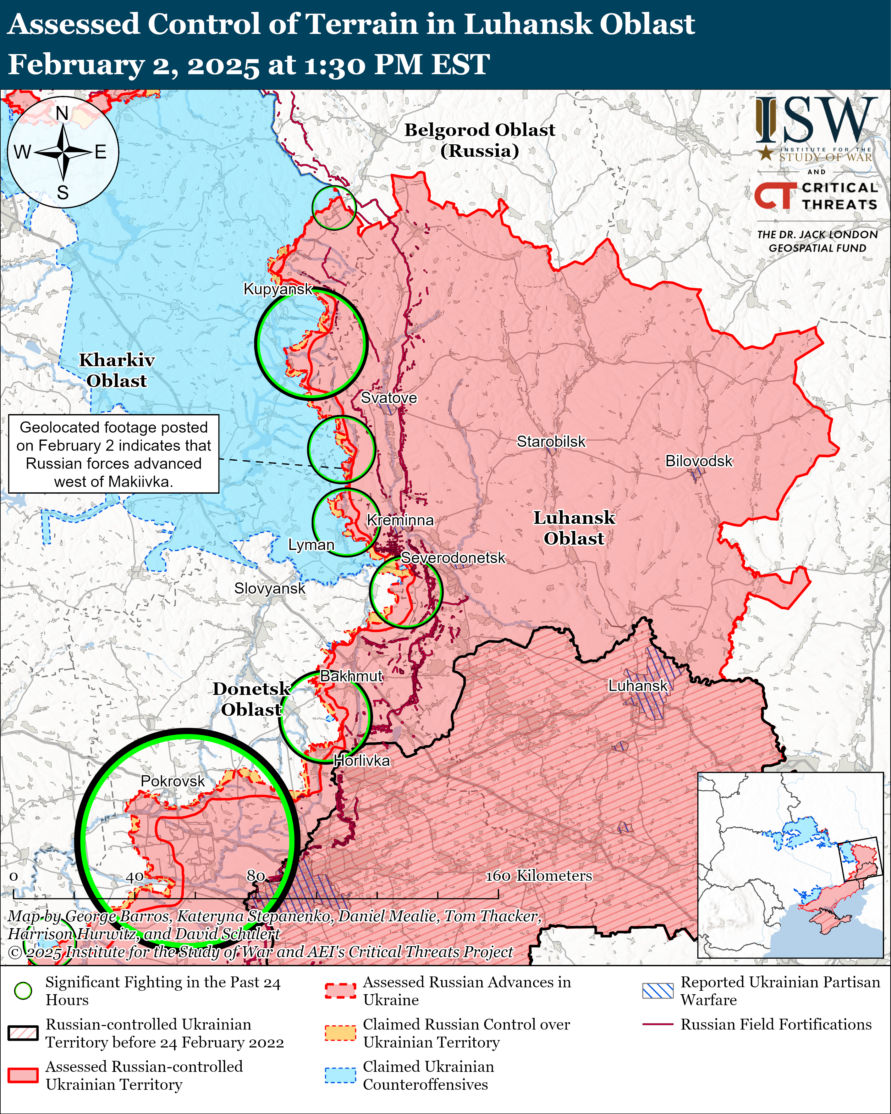 - Оккупанты также недавно продвинулись на Покровском направлении. Речь идет об определенных успехах врага вдоль линии Донецкой железной дороги у Котлино. Также российские войска 1 и 2 февраля вели наступательные операции в районах Зеленого Поля, Водяного Второго, Тарасовки, Миролюбовки, Луча, Котляровки, Елизаветовки, Зверевого, Удачного, Успеновки, Новоалександровки и Серебряного. По некоторым данным, ВСУ контратакуют вблизи Новоелизаветовки и Новосергиевки. Кроме того, российские силы могли продвинуться к центру Успеновки, но ВСУ удерживают позиции в юго-западной части этого населенного пункта.