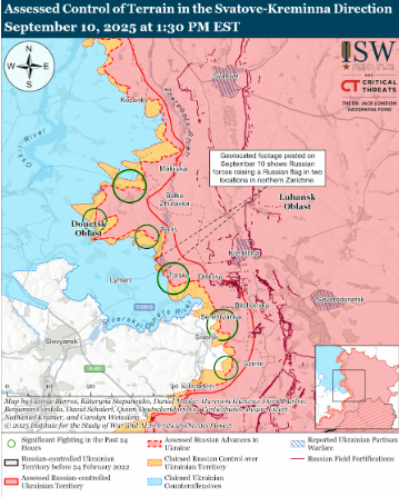 Недавно российские войска продвинулись на Лиманском направлении. Видеозаписи, опубликованы 10 сентября, свидетельствуют, что оккупанты подняли флаги в двух местах на севере Заречного. Начальник разведки украинского полка, действовавшего на этом направлении, заявил, что ВСУ отбили Заречное, а российские войска вошли в населенный пункт, переодевшись в гражданскую одежду. Вражеские атаки фиксировали вблизи Среднего, Шандриголово, Карповки, Нового Мира, Новомихайловки, Колодязов, Торского, Заречного, Ямполя и Серебрянского лесничества.