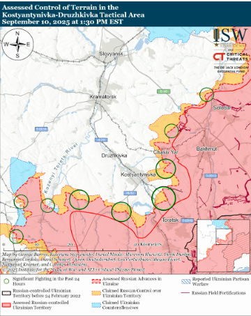 10 сентября российские войска продолжили наступательные операции на Северском направлении, но не продвинулись вперед. Они атаковали вблизи Дроновки, Григорьевки, Серебрянки, Выемки, Федоровки и в направлении Пазено.