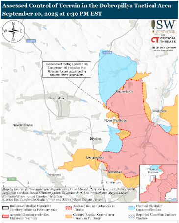 Российские войска недавно продвинулись в тактическом районе Доброполья. Геолокационные кадры, опубликованные 10 сентября, свидетельствуют о том, что они имеют продвижение в восточной части Нового Шахматного. Наступательные операции также велись вблизи Золотого Колодца, Вольного, Заповедного и Маяка.