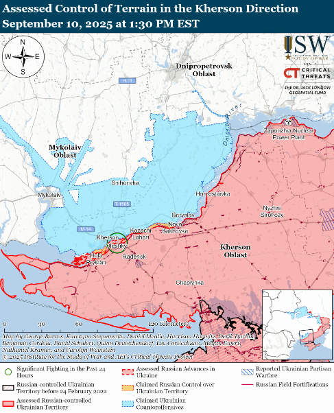 10 сентября российские войска продолжили наступательные операции на Херсонском направлении, но не продвинулись вперед. Они атаковали вблизи Антоновки и Садового.