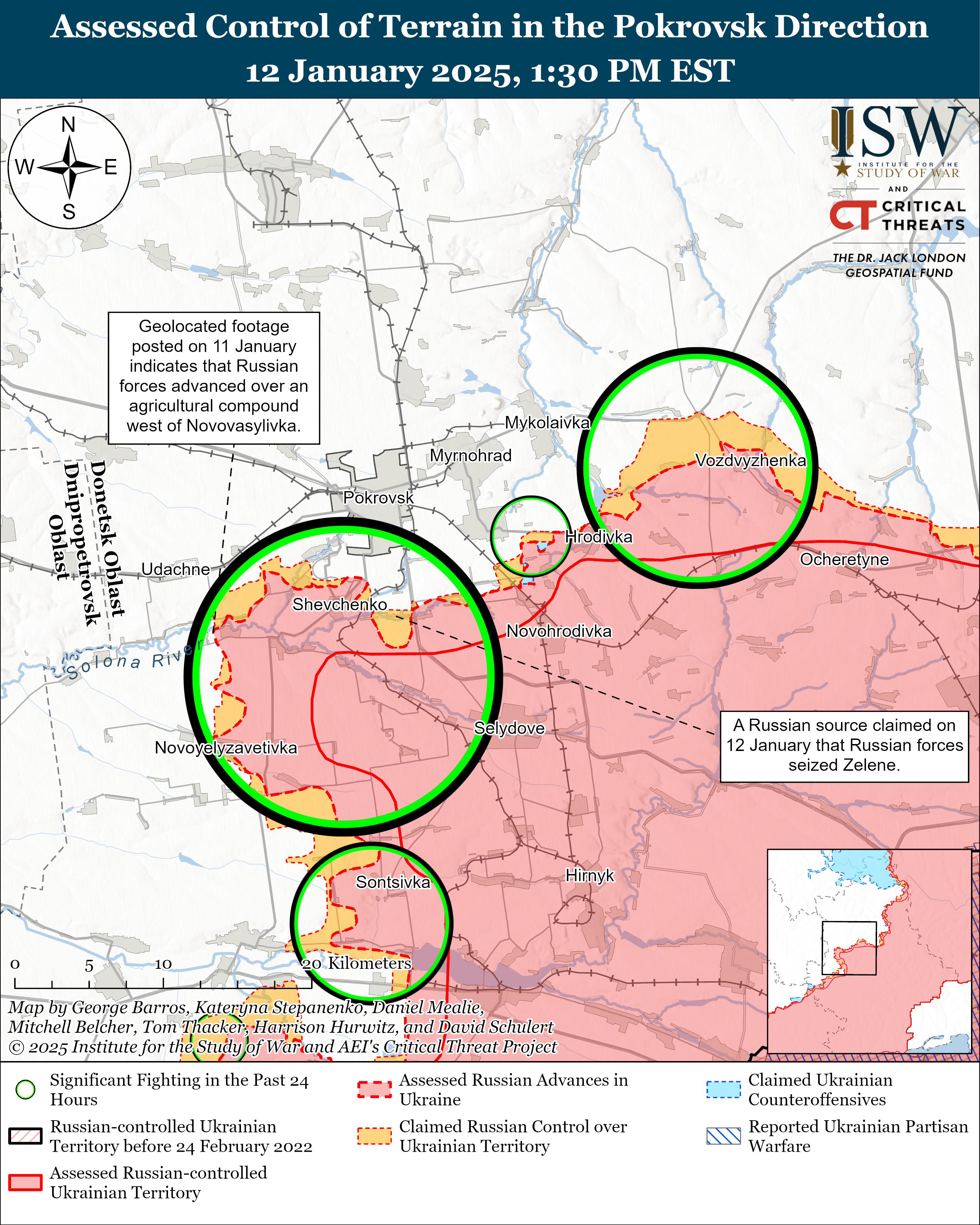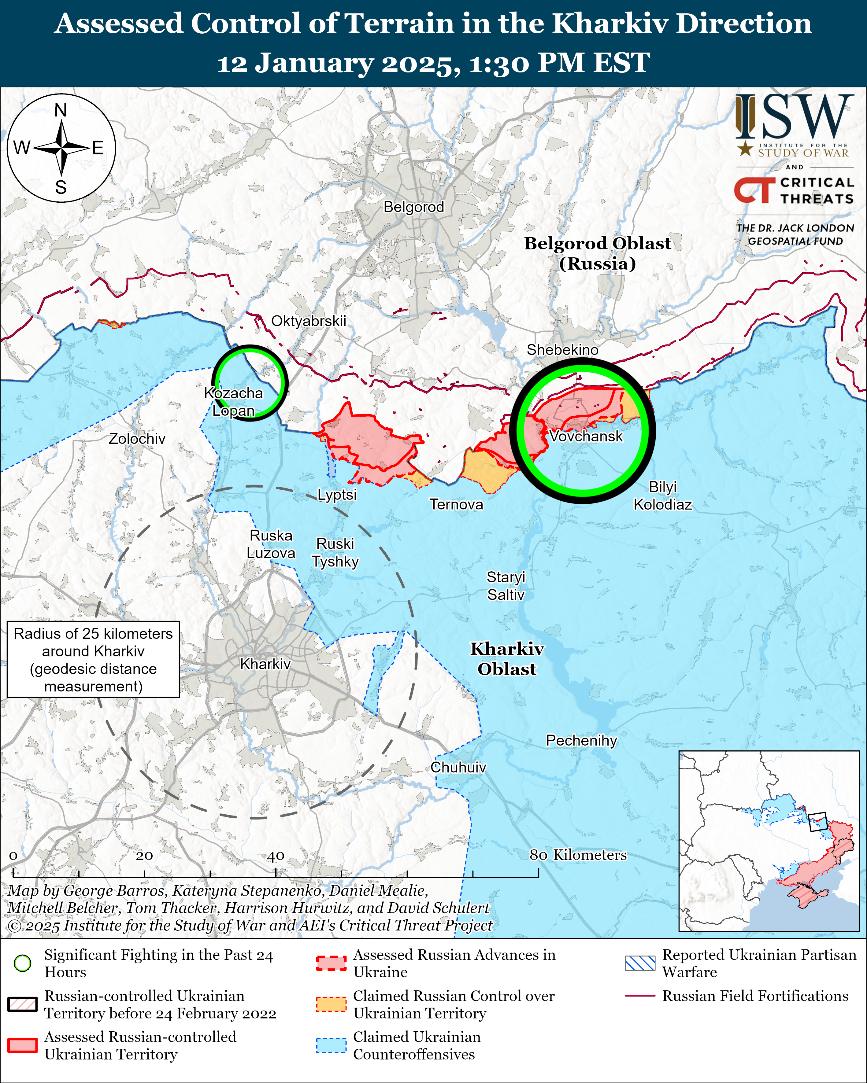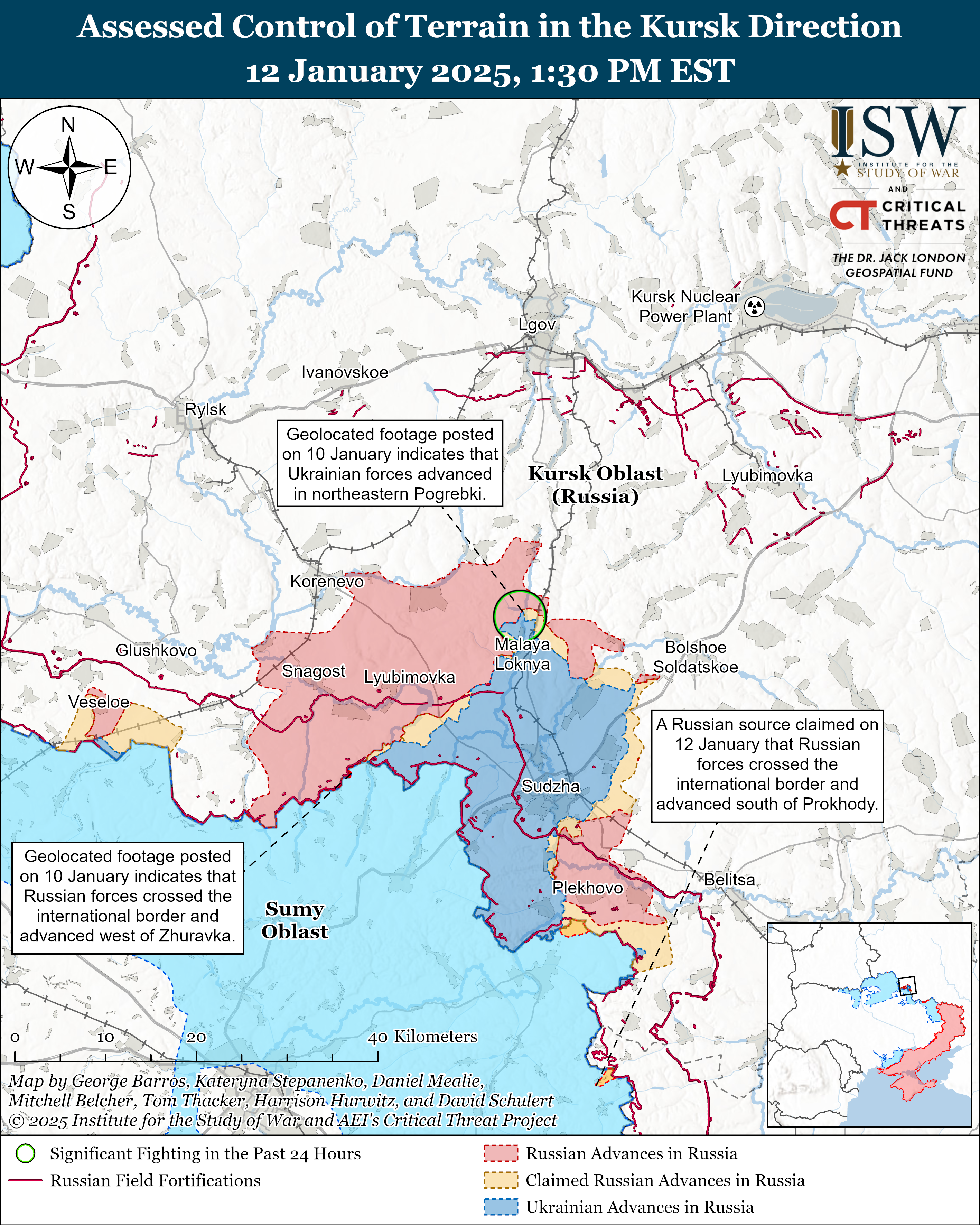- На днях россияне пересекли границу Курской области с Сумской и продвинулись на запад от Журавки. Также они 12 января продолжали наступательные действия в пределах основного украинского выступа, но не сделали ни одного подтвержденного продвижения. ВСУ сохраняют позиции в Погребках, несмотря на недавние заявления о захвате населенного пункта российскими войсками.