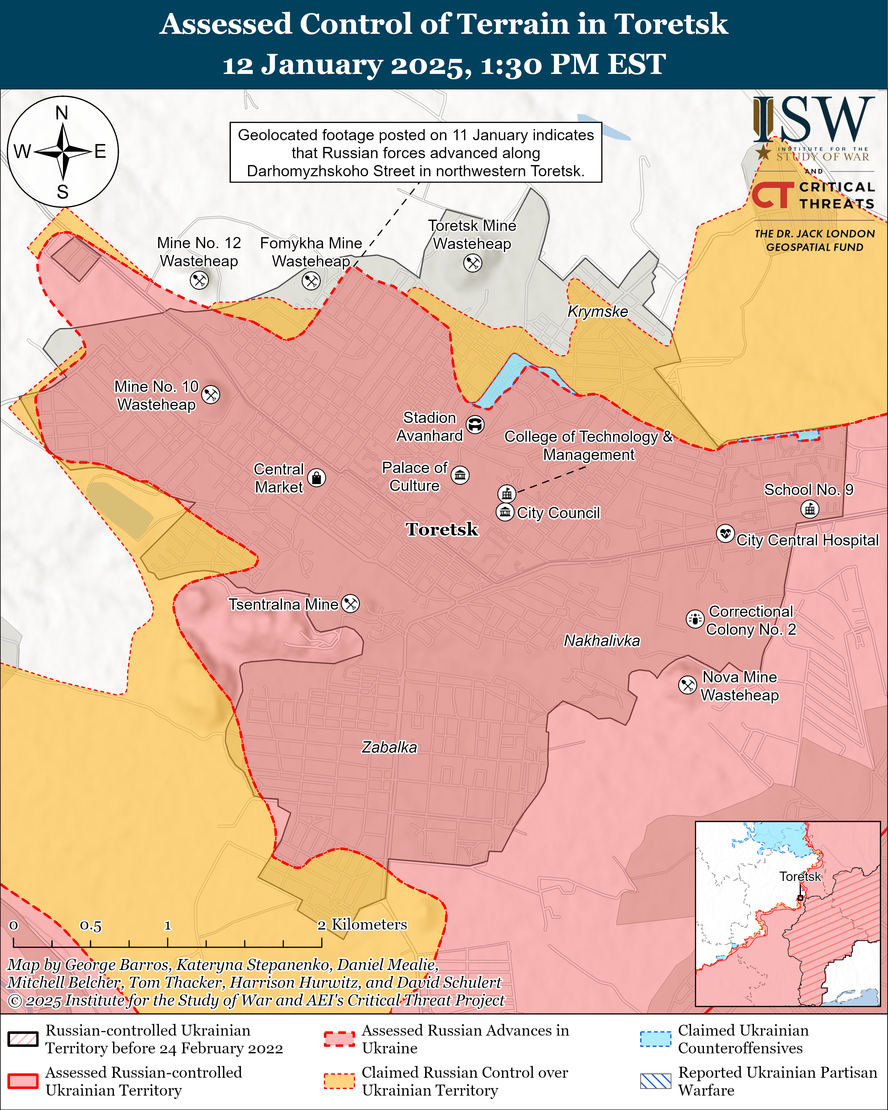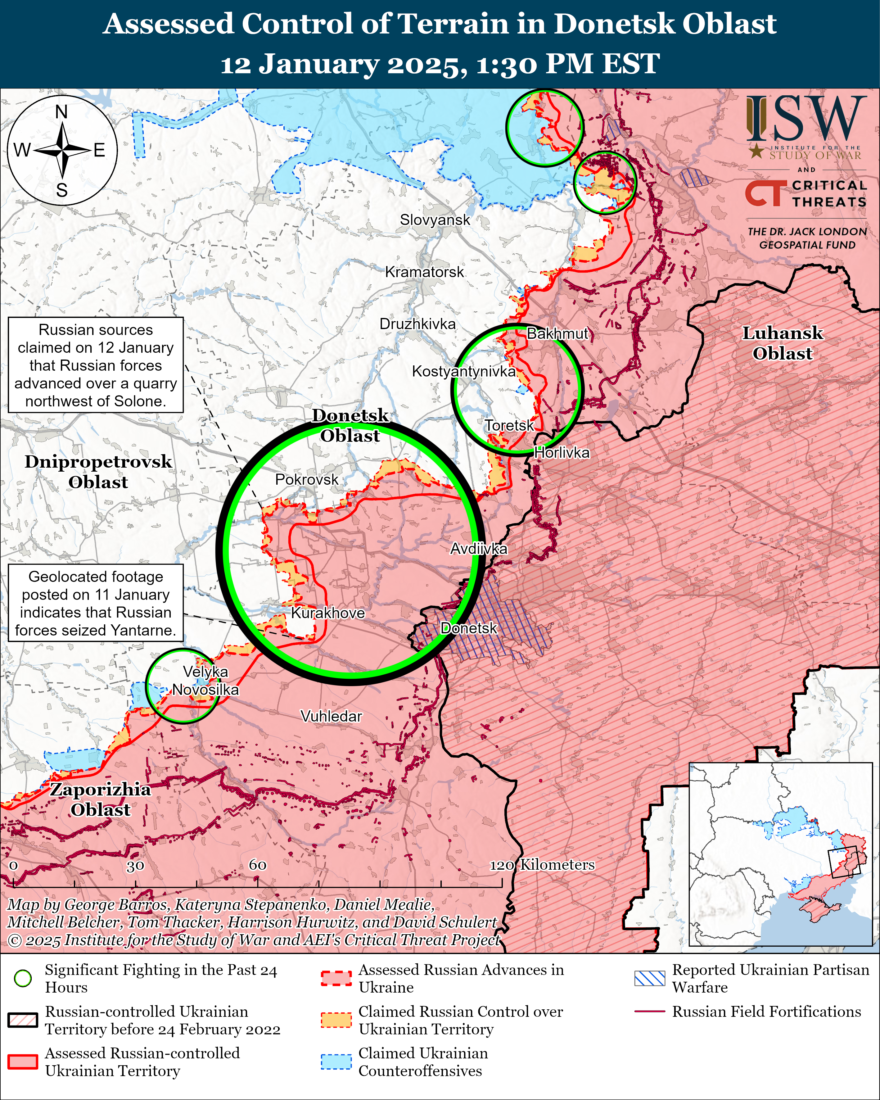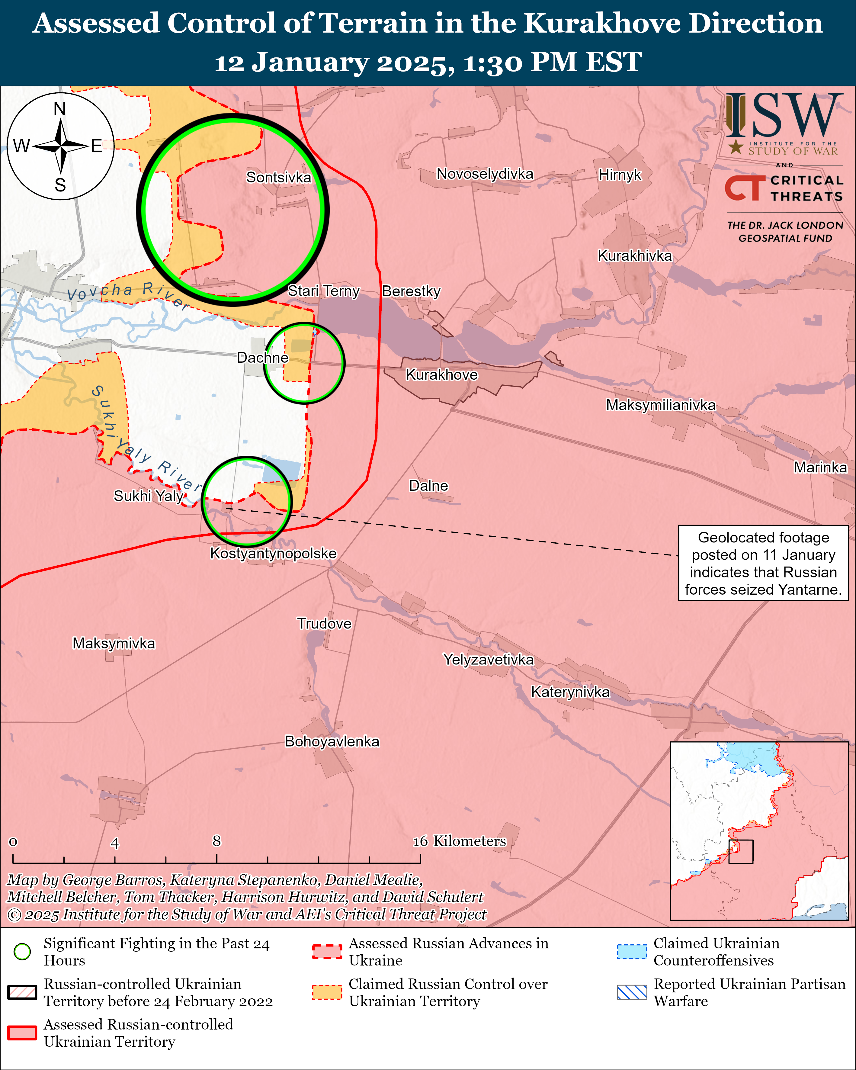 - На днях россияне пересекли границу Курской области с Сумской и продвинулись на запад от Журавки. Также они 12 января продолжали наступательные действия в пределах основного украинского выступа, но не сделали ни одного подтвержденного продвижения. ВСУ сохраняют позиции в Погребках, несмотря на недавние заявления о захвате населенного пункта российскими войсками.
