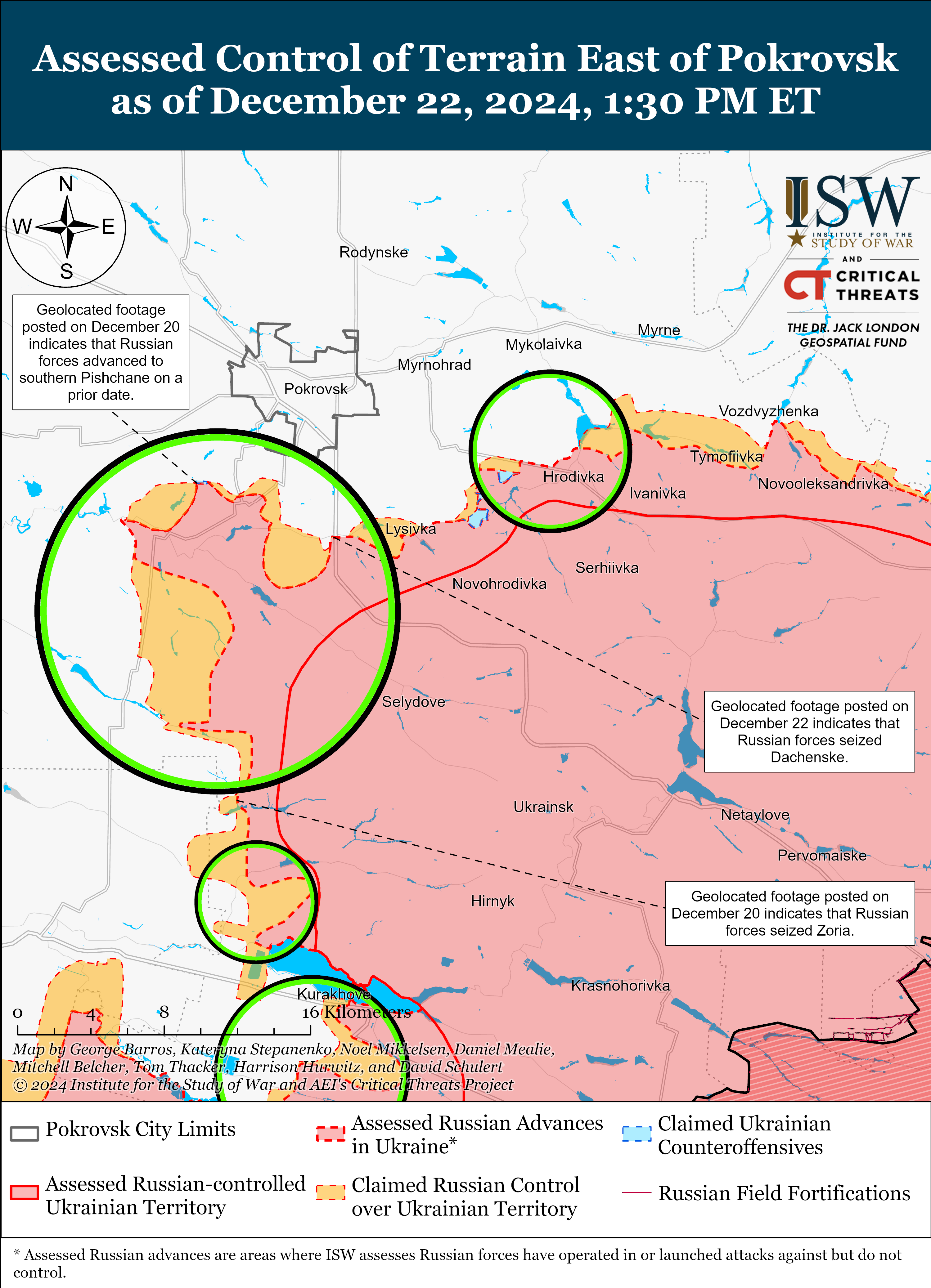 - Россияне 22 декабря продвинулись также на Покровском направлении и захватили населенный пункт Даченское. Они вели наступательные действия под самым Покровском, у Луча, Миролюбовки, Лисовки, Зеленого, Нового Труда, Новоукраинки, Нововасильевки, Новоелизаветовки и Новооленевки.