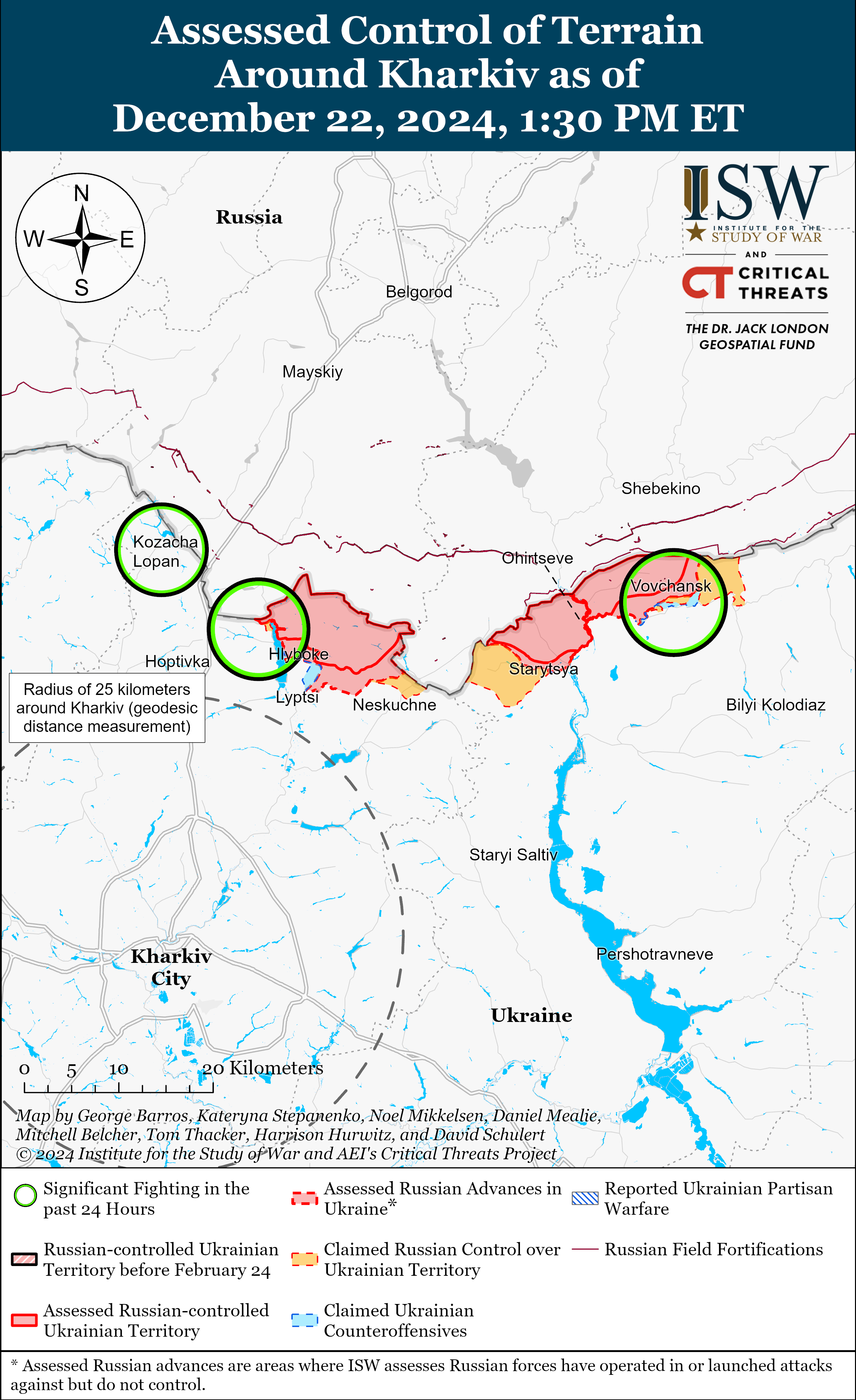 - 22 декабря российские войска продолжили атаки на Харьковском направлении в районах Казачьей Лопани, Гоптовки, Глубокого и Высокой Яруги, а также у Старицы и Волчанска, однако никаких продвижений там не подтверждено.