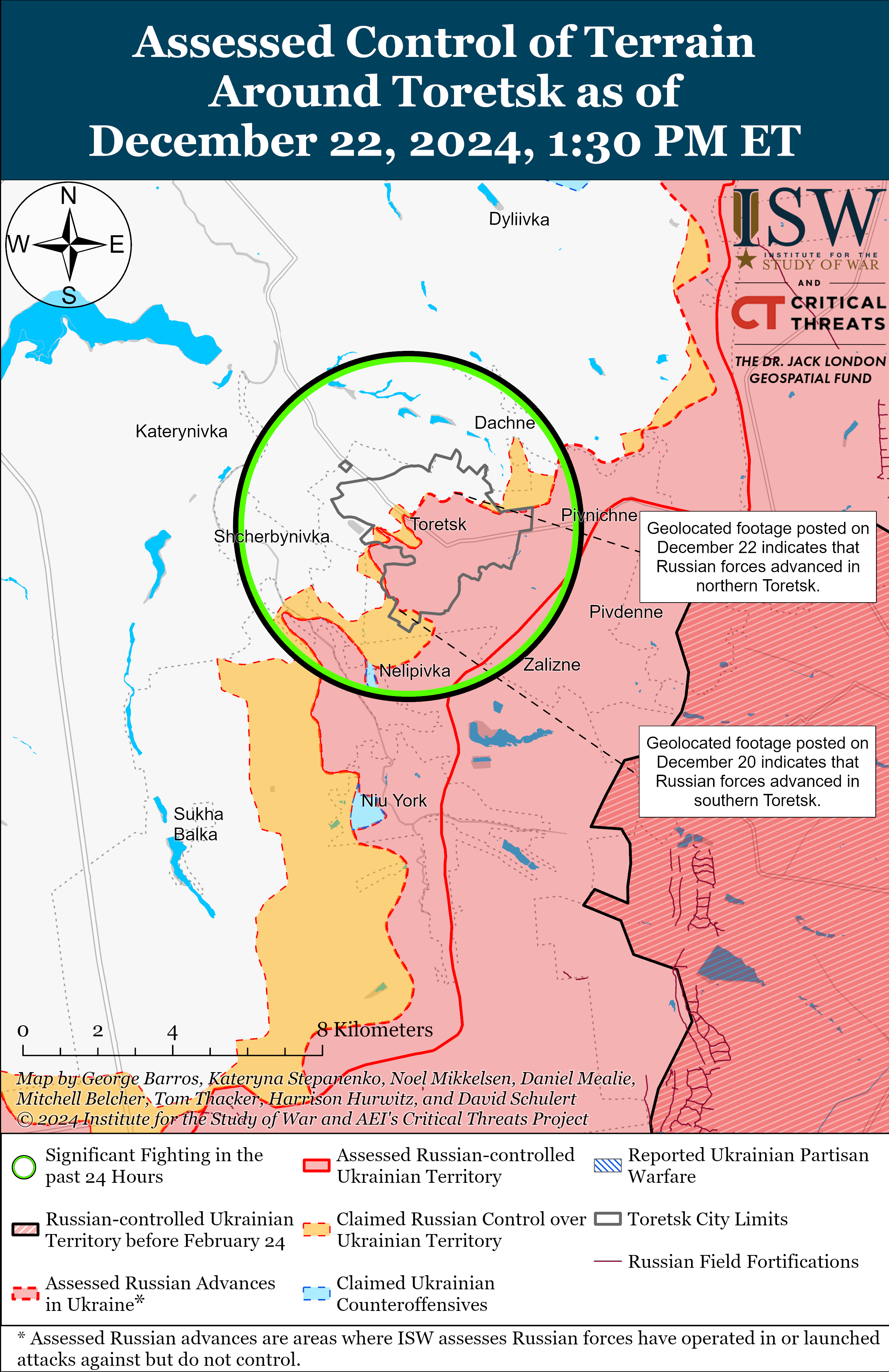 - 22 декабря российские войска также вели наступление на Угледарском направлении в районе Успеновки, Константинополя, Янтарного, Разлива, Большой Новоселки, Раздольного, Одрадного, Макаровки, Благодатного, Нескучного, Сторожевого, Временки, Новоселки. К счастью, там также нет подтвержденных наступлений.