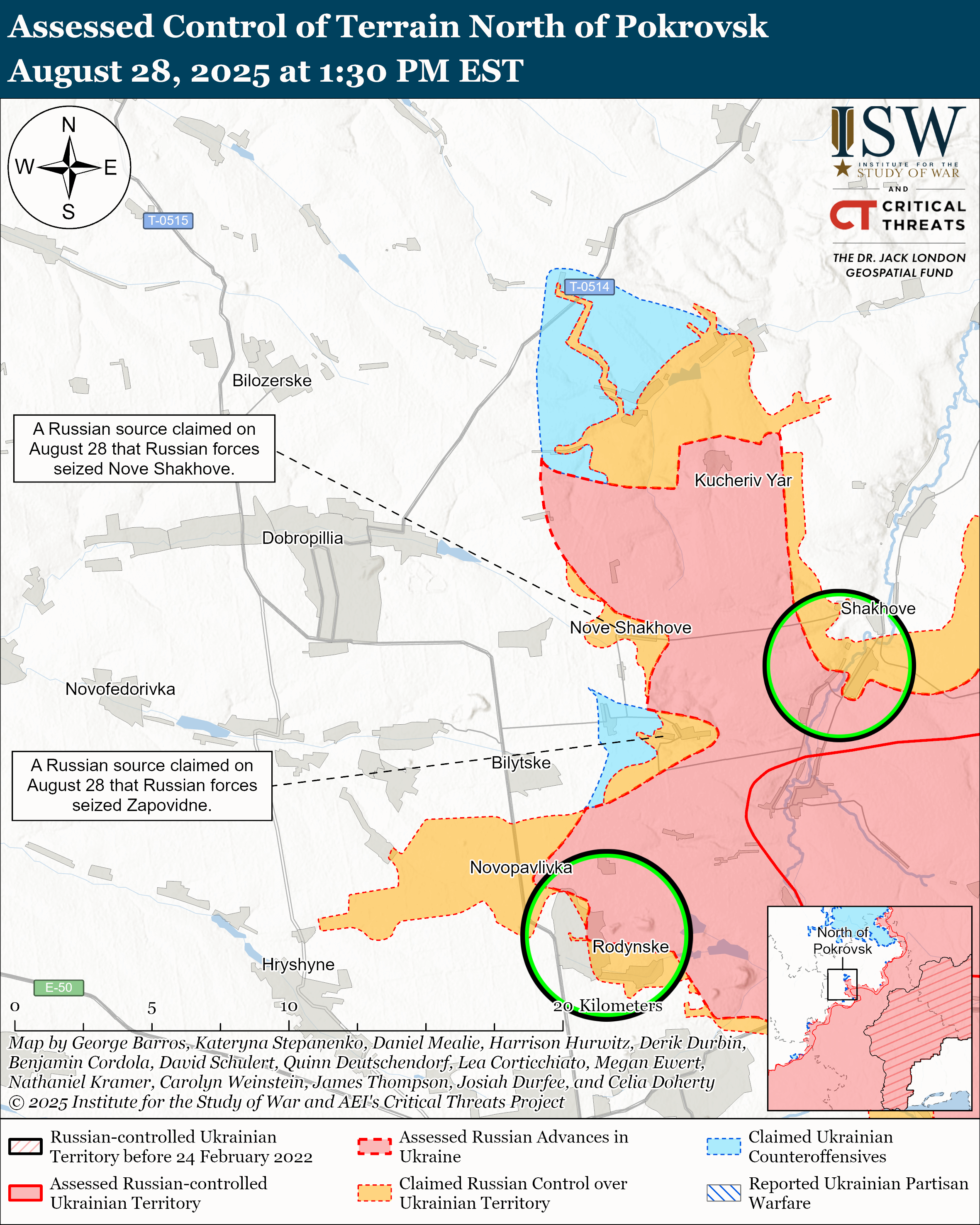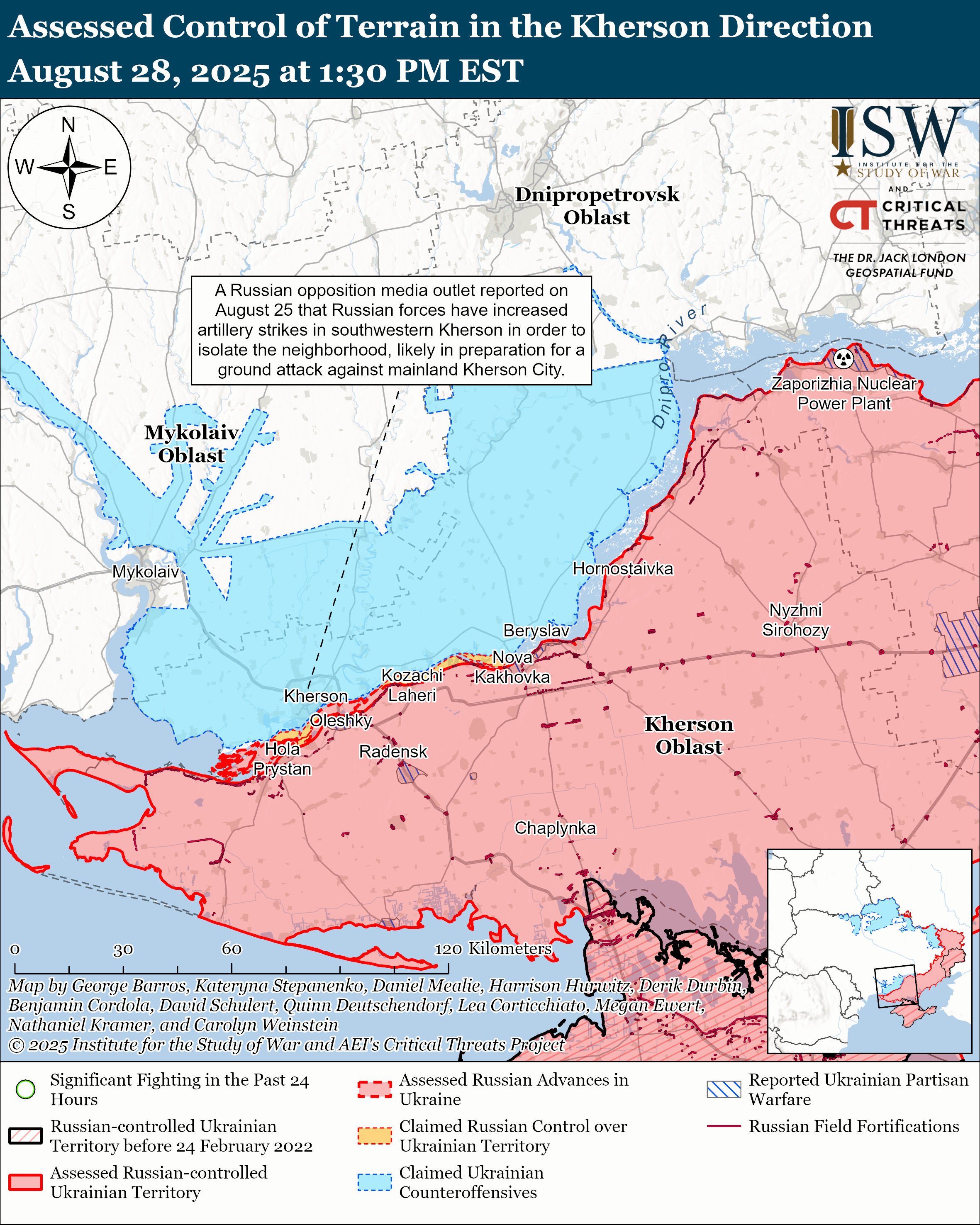 - 28 августа российские войска продолжали ограниченные наступления на Херсонском направлении, но не продвинулись вперед.