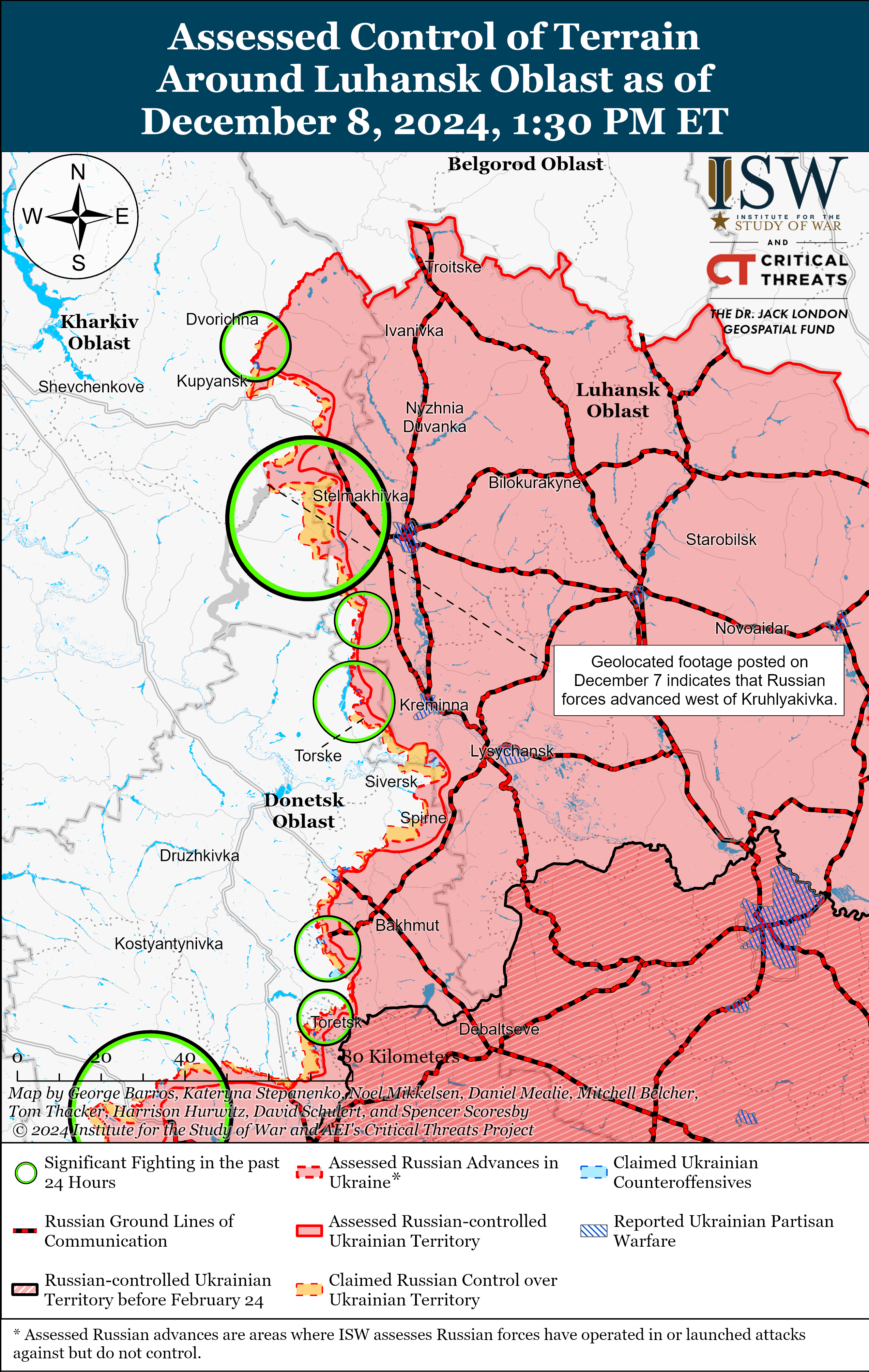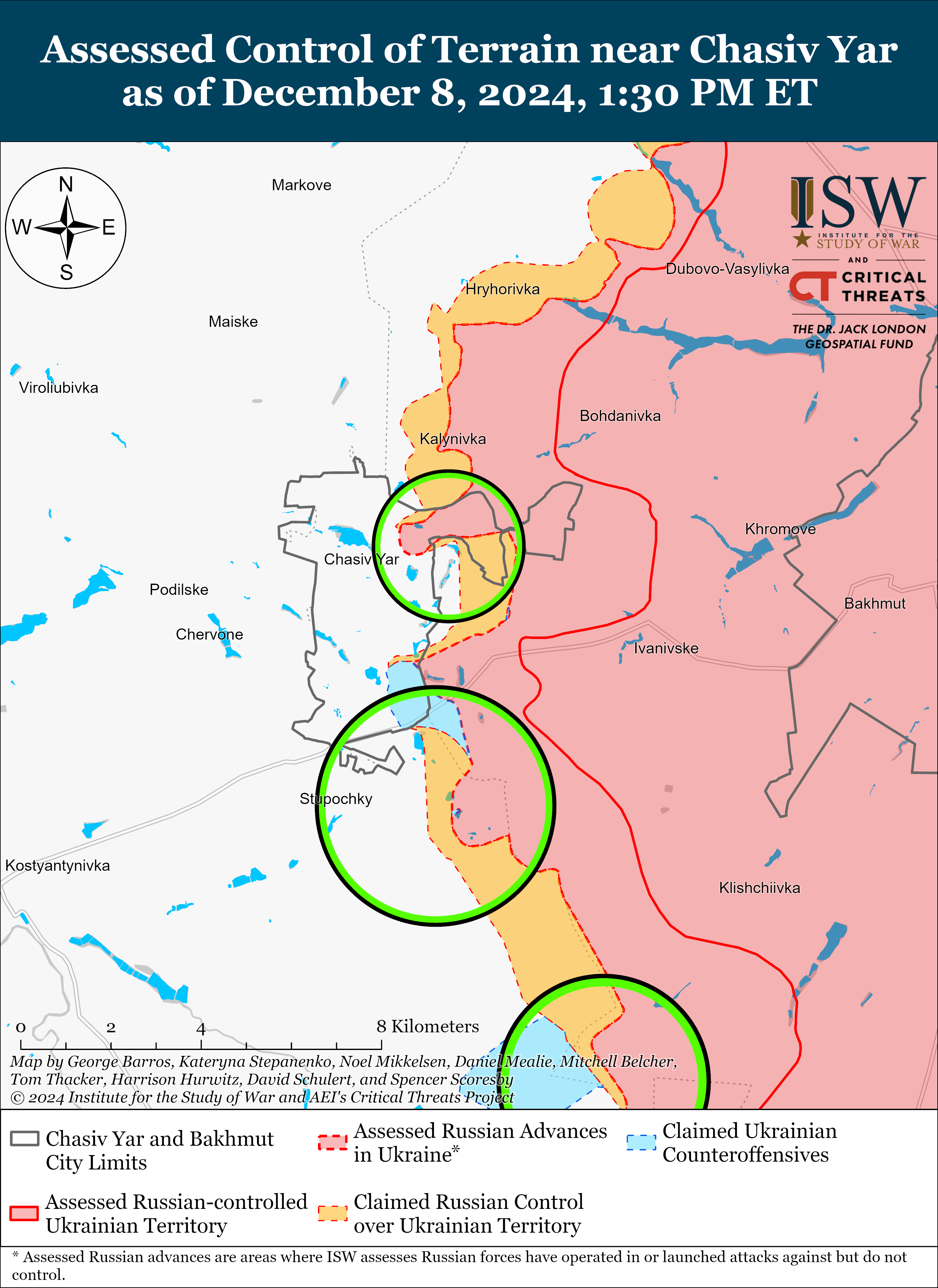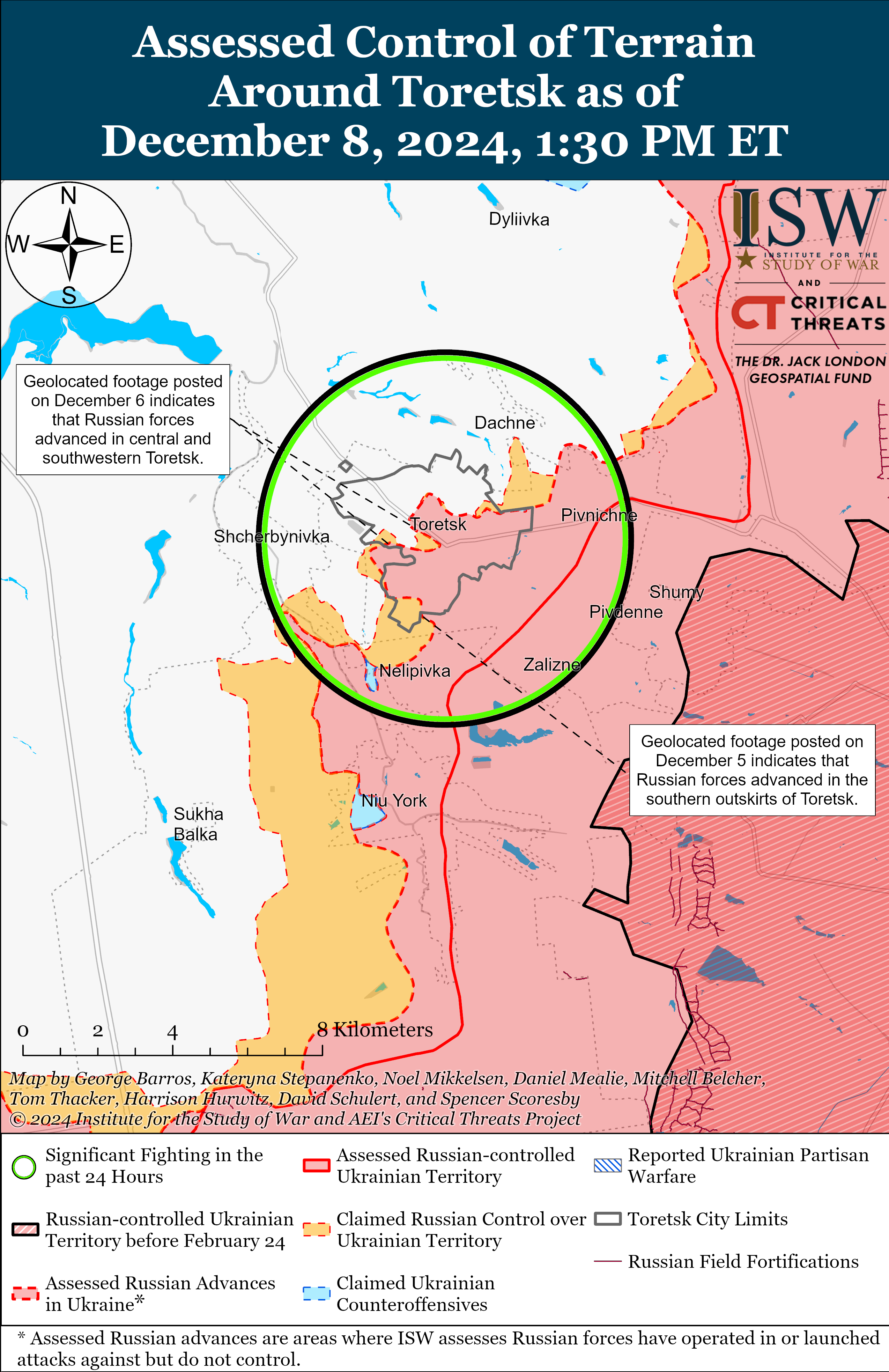 - Российские войска 8 декабря продолжали наступательные действия и на Торецком направлении. Наступали в пределах и вблизи самого Торецка, а также у Дилиевки, Щербиновки, Нелеповки и Леонидовки. Подтвержденных продвижений они не сделали.