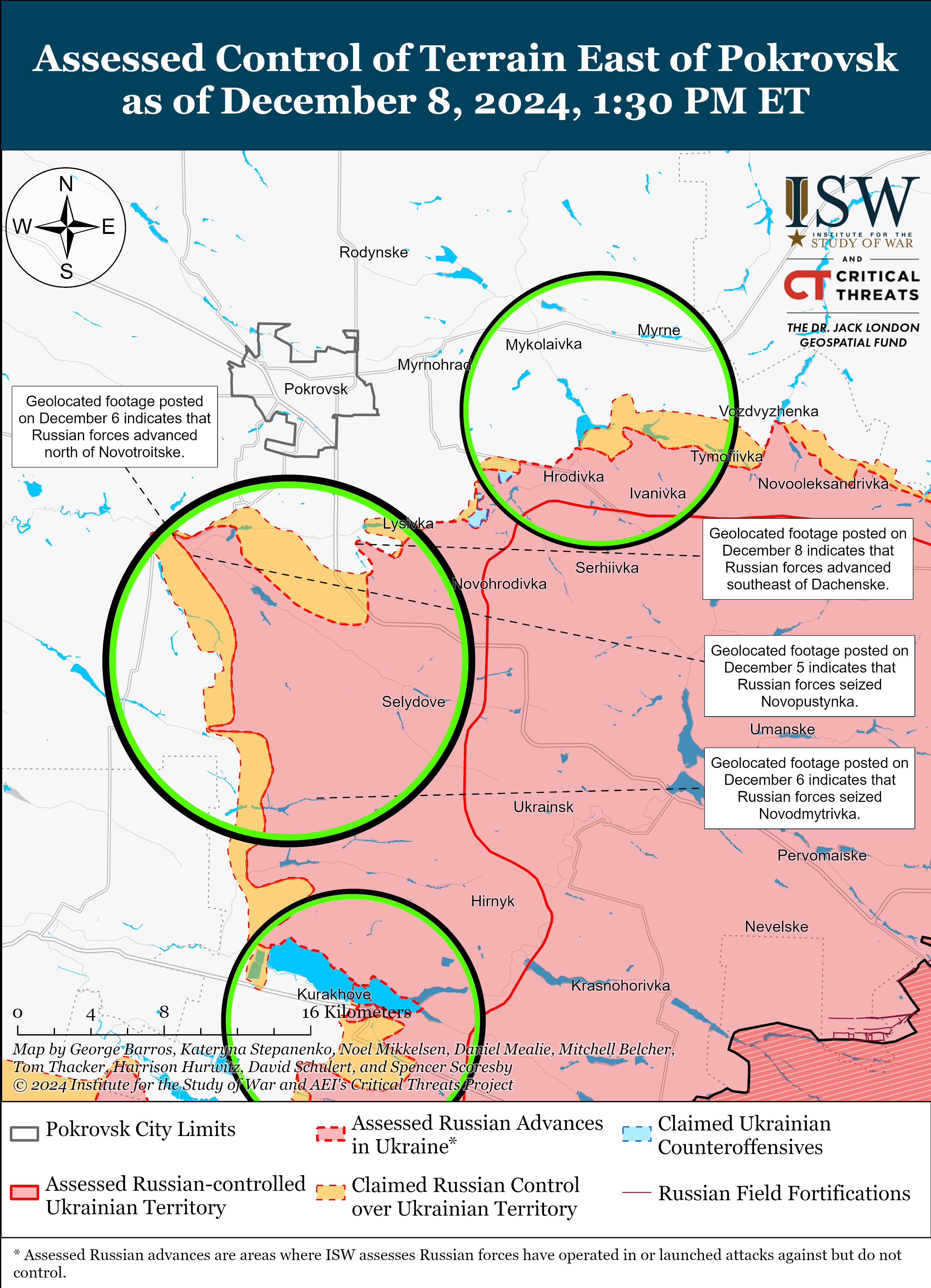 - Российские войска, по данным геолокационных кадров 7 – 8 декабря, продвинулись на Покровском направлении вблизи Украинки и Даченского. Наступление также продолжалось в районе Миролюбовки, Мирнограда, Гродовки, Проминя, Лысовки, Сухого Яра, Желтого, Даченского, Пушкино, Шевченкового, Нового Труда, Зеленого, Новотроицкого.