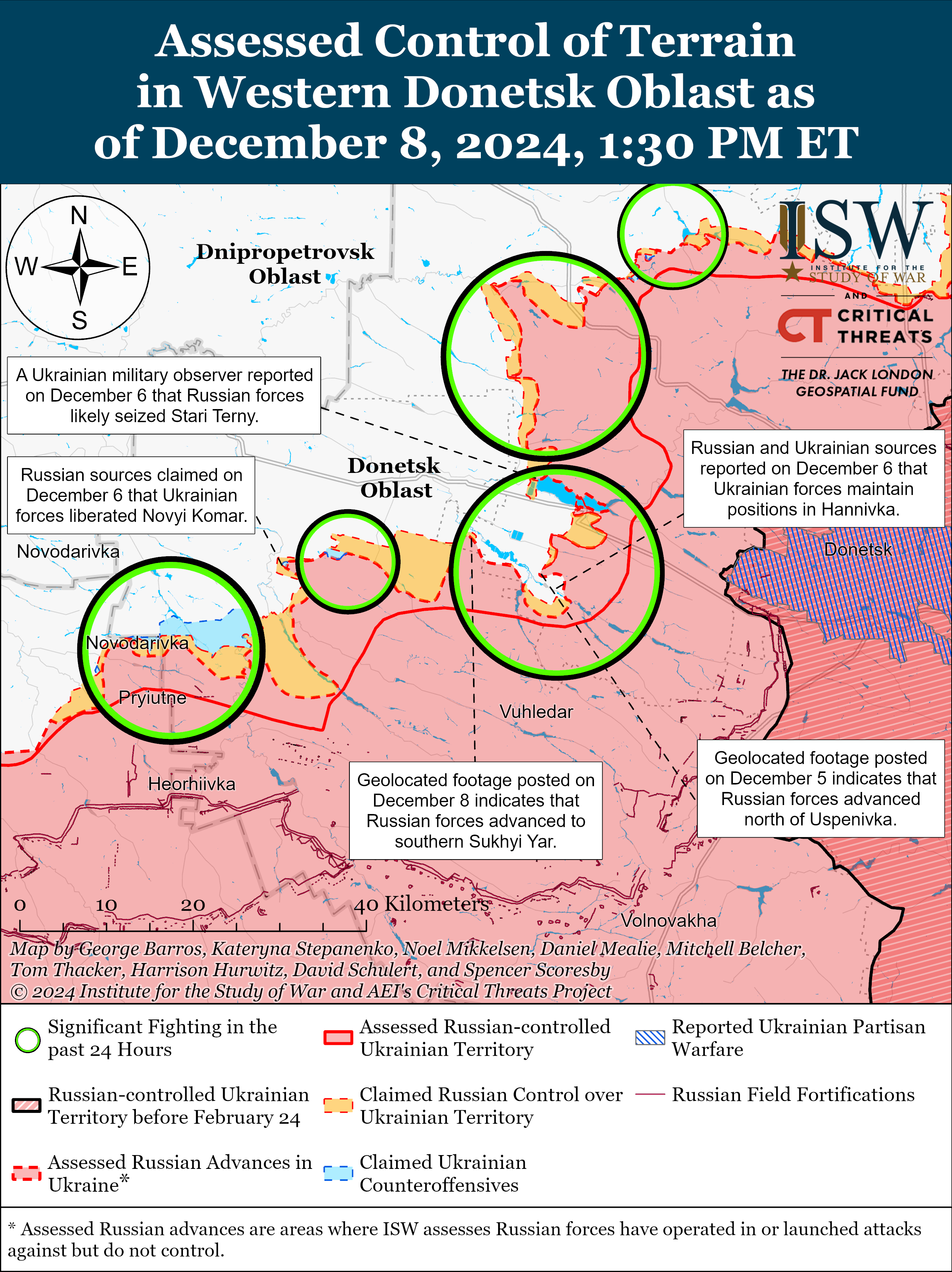 - Однако российские войска 8 декабря несколько продвинулись на Угледарском направлении у Сухих Ялов, Катериновки, Антоновки, Елизаветовки и Романовки, Анновки, Веселого Гая, Успеновки, Константинопольского и Разлива. Также они продолжали наступление в районе Большой Новоселки, но ни одного подтвержденного продвижения не сделали. По некоторым данным, ВСУ контратакуют у Благодатного.