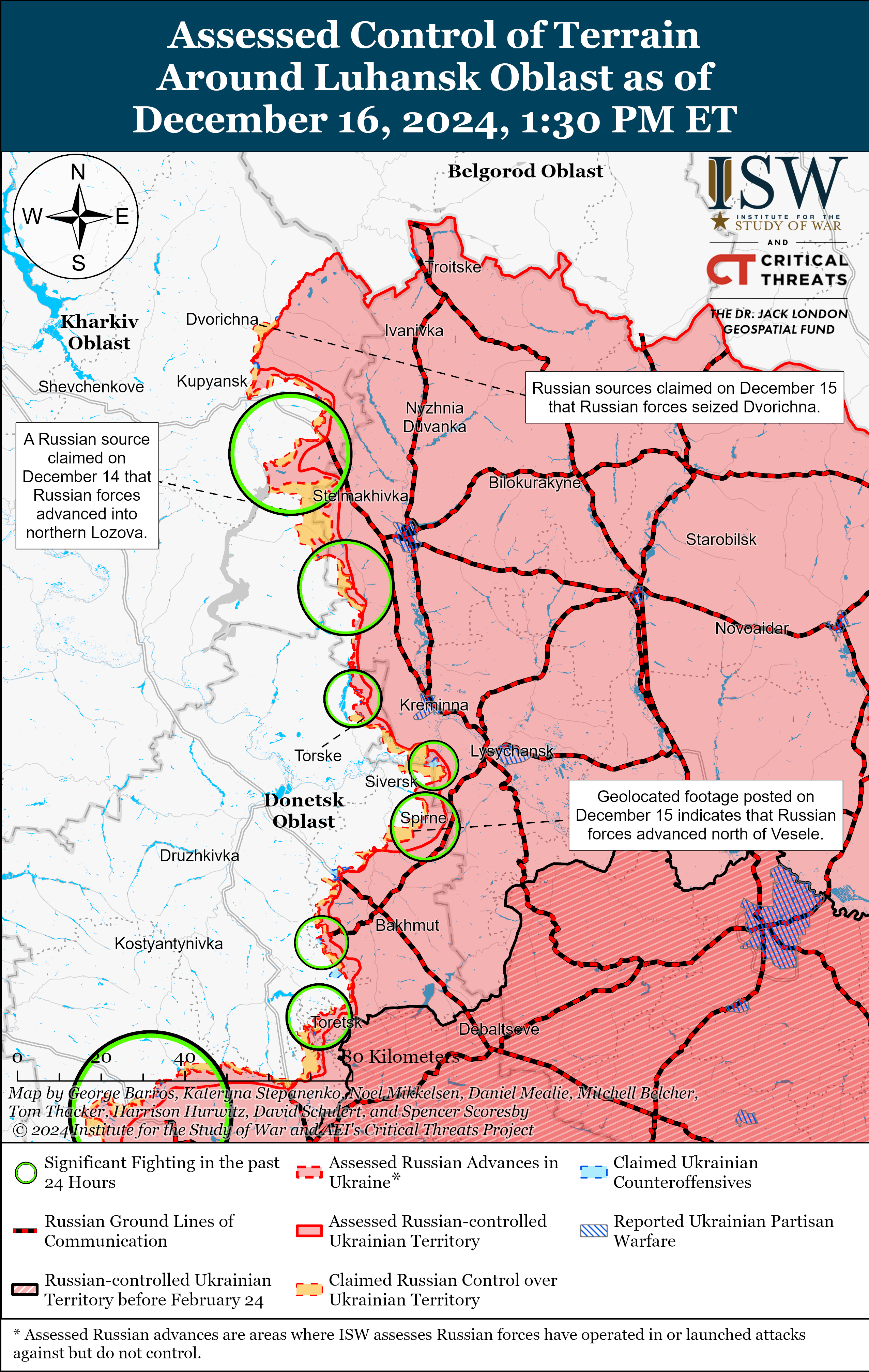 Российские войска недавно продвинулись вблизи Торецка. Российские милблогеры утверждали, что есть продвижение к западному Торецку и на южной окраине породных отвалов шахты "Центральная" в центре города, однако ISW не нашло подтверждения этим утверждениям.