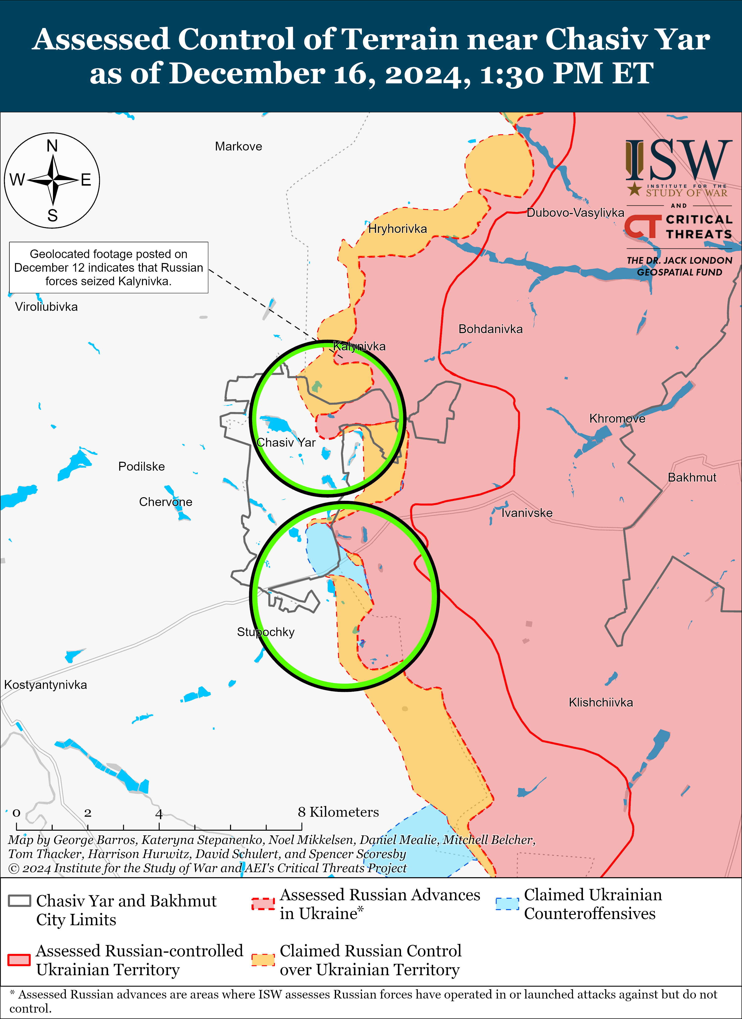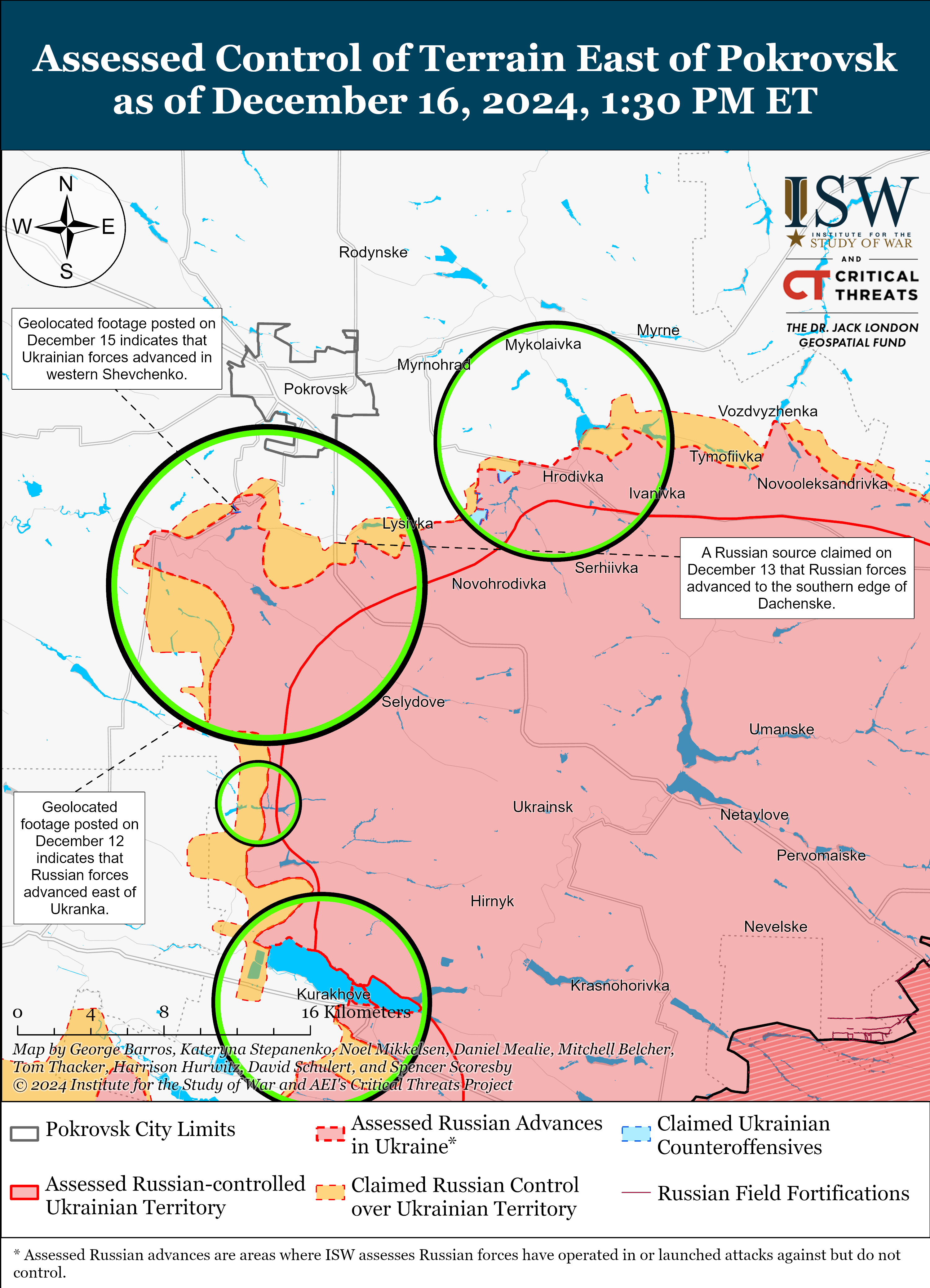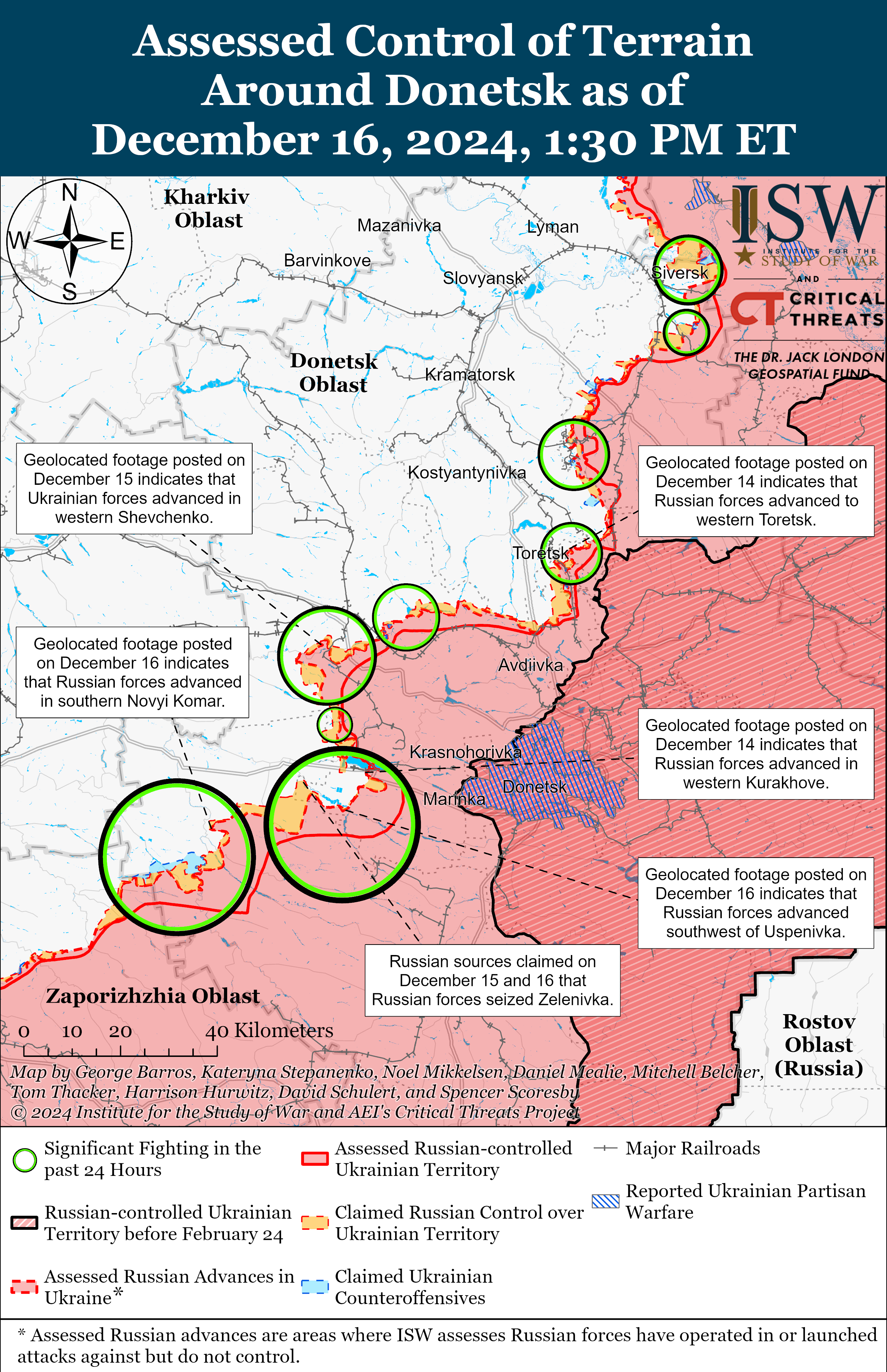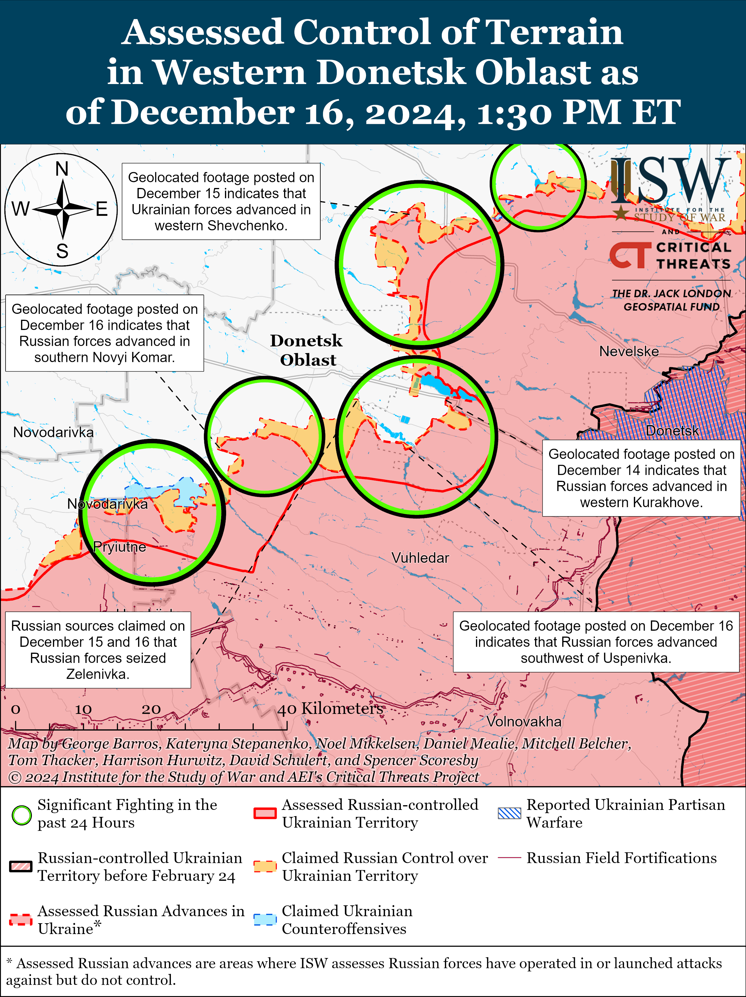Российские силы недавно продвинулись на северо-запад от Курахово. Также есть продвижение на север от Зари. Российские милблогеры утверждали, что российские войска продвинулись к северу от Дальнего и достигли окрестностей Шевченко с позиций в Старых Тернах, хотя ISW пока не нашло подтверждения ни одному из этих заявлений.