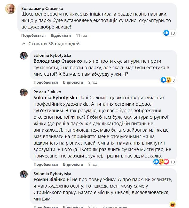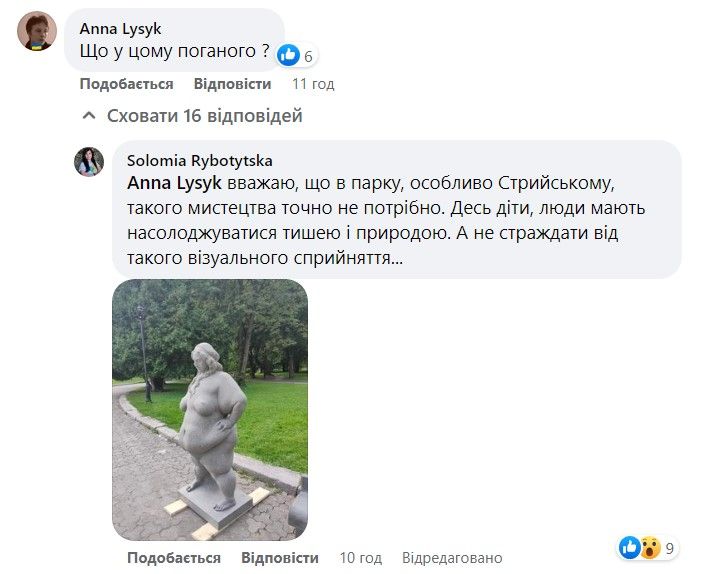 Соломию Рыботицкую – депутатку Львовского областного совета от "Европейской Солидарности" – почему-то очень возмутили скульптуры. Она назвала их "советским мусором". Впоследствии женщина редактировала свое сообщение и теперь спрашивает: "Кому нужны эти монстры?"
