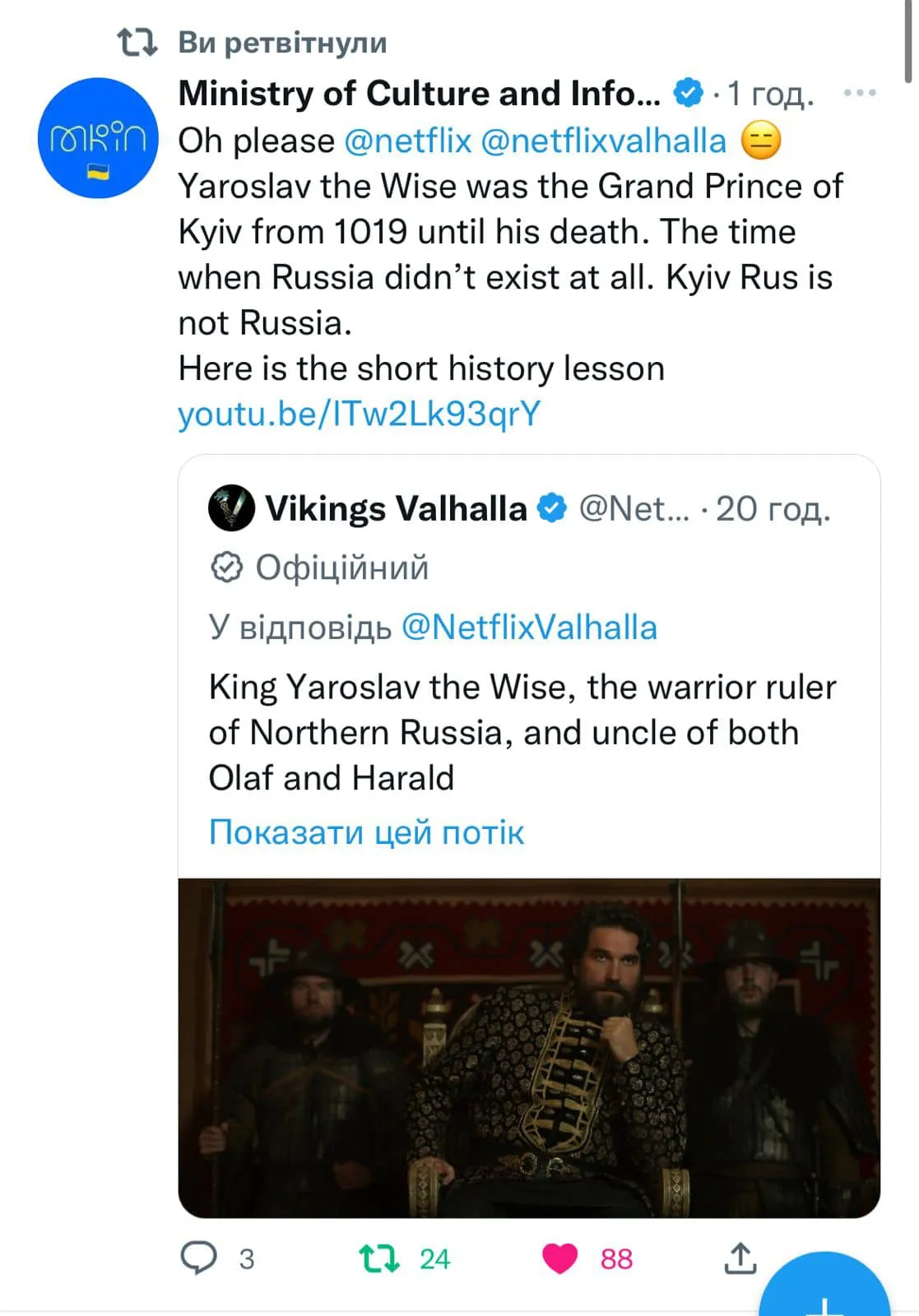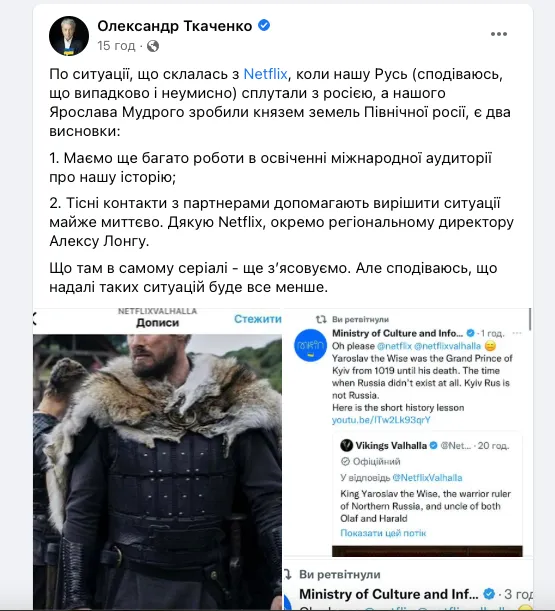 Читайте также Netflix удалил твит, в котором спутал Киевскую Русь и Россию, по просьбе Минкульта