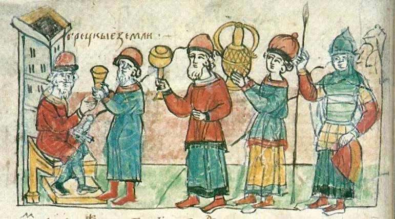 Миниатюра из Радзивиловской летописи 15 века показывает русских купцов, вернувшихся из Царьграда