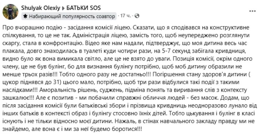 Оказалось, что София и Марина держат в страхе весь класс и издеваются над другими детьми. Однако директор, завуч и учителя обвиняют Алексея Шуляка, который дал огласку ситуации, и критикуют Викторию Шуляк. Каких-то комментариев журналистам они не дали, мол, расследование буллинга должно происходить конфиденциально. Даша Шуляк находится в больнице.