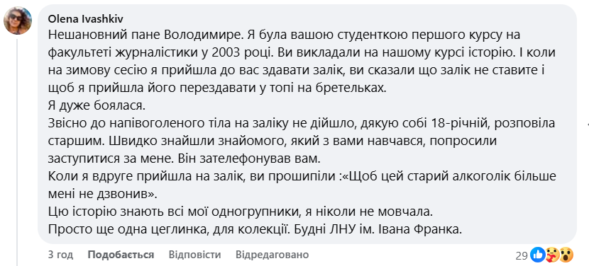 Своим опытом поделилась также журналистка Елена Ивашкив. В комментариях она рассказала, что была студенткой Владимира Качмара на первом курсе факультета журналистики в 2003 году.