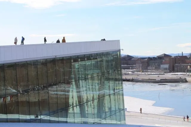 В Осло в Оперу можна не тільки піти, а й походити по ній. Так вже її задумали архітектори. Дах напівфантастичної будівлі похилений в бік води, і по ньому можна вибратись на найвищу точку театру. Виходить така собі компенсація зайнятої площі ледь не в самому центрі міста на березі Осло-фьорду. З даху Опери відкривається чудовий вид на місто. Гарно мріяти тут з птахами просто неба.