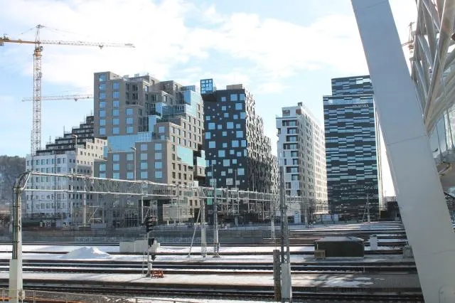 Вчергове переконуюсь: ні в Норвегії, ні у всієї Скандинавії немає проблем з поєднанням минулого зі сучасністю. Кожна епоха існує тут без шкоди для іншої. З одного боку, тут є король і багато кого спраді захоплює така середньовічна романтичність. З іншого боку - про Норвегію ми багато чуємо і читаємо як про країну з високим рівнем життя, свободою слова та дотриманням на високому рівні принципів демократичного суспільства. І відсутність членства в Євросоюзі також не є для цього перешкодою. Як же ж не захопитись на хвилинку успіхом цієї країни? Але я досі на даху Опери, звідки моїм широко здивованим очам відкривається цілий комплекс сучасних будівель. Правда, вони ще в процесі будівництва, як і частина доріг чи нових транспортних розв'язок у місті. Далі - ще однин кадр для фантазування.