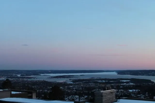 Тепер, ще до заходу сонця, мені треба встигнути піднятись на пагорб, з якого відкривається панорама всього міста. Туди мене везе метро, змійкою піднімаючись схилом вгору. І я опиняюсь на вершині у прекрасний сутінковий час. Осло і фьорд можна побачити звідси під зовсім іншим ракурсом, у зовсім інших вечірніх кольорах.