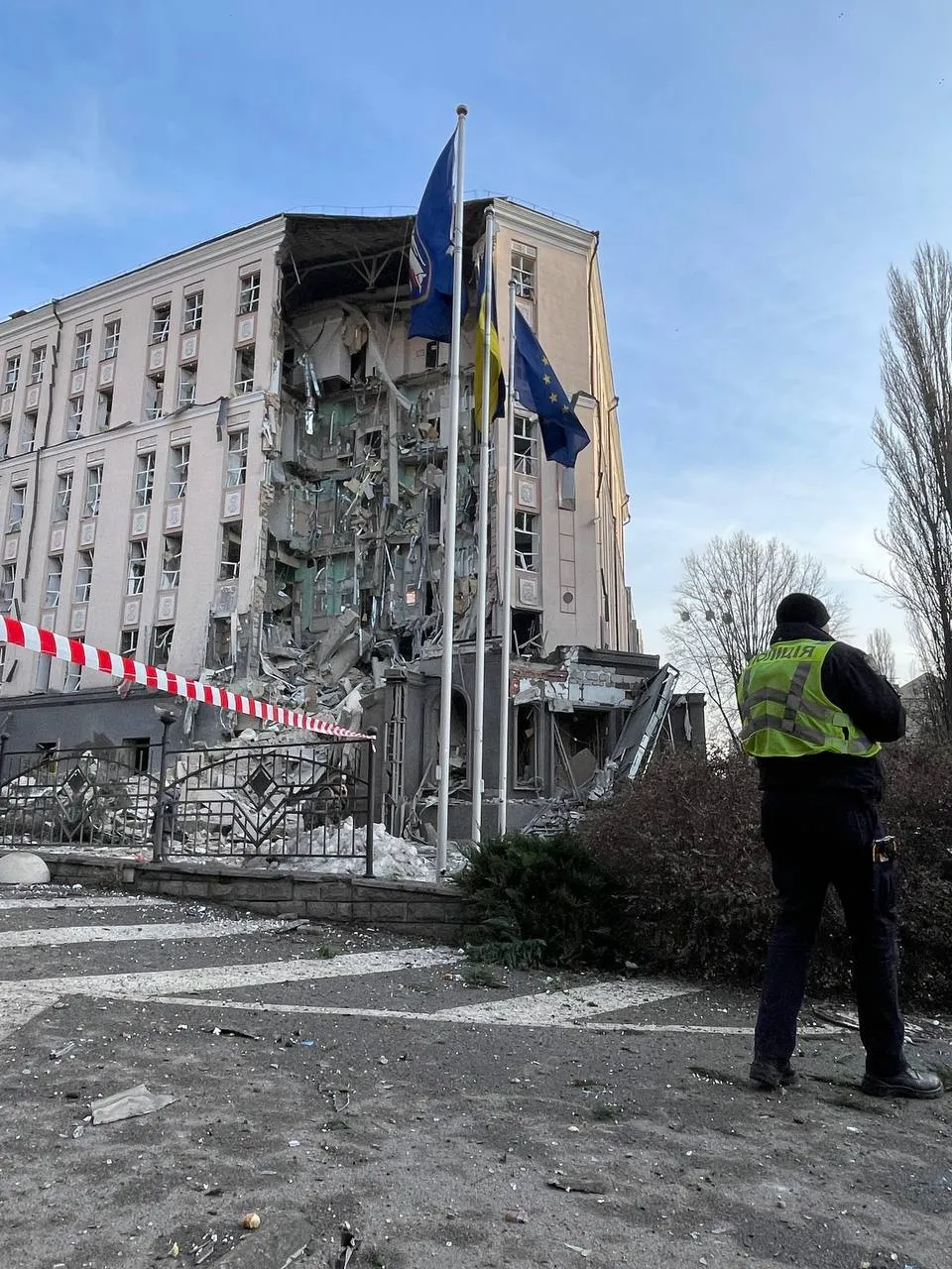 В офисе Президента показали последствия атаки по столице Украины. На фото заметно, что российские оккупанты попали в гостиницу в центре Киева.