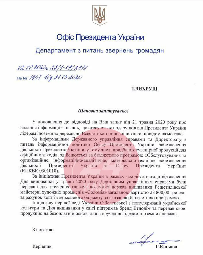 Напомним, 21 мая Офис Президента сообщал, что такие рубашки получили в подарок лидеры Соединенных Штатов Америки, Федеративной Республики Германия, Французской Республики, Канады, Республики Польша, Турецкой Республики и других стран. При этом в первом варианте сообщение там допустили ошибку, указав, что их получили президенты этих стран, забыв, что в Канаде нет должности президента.