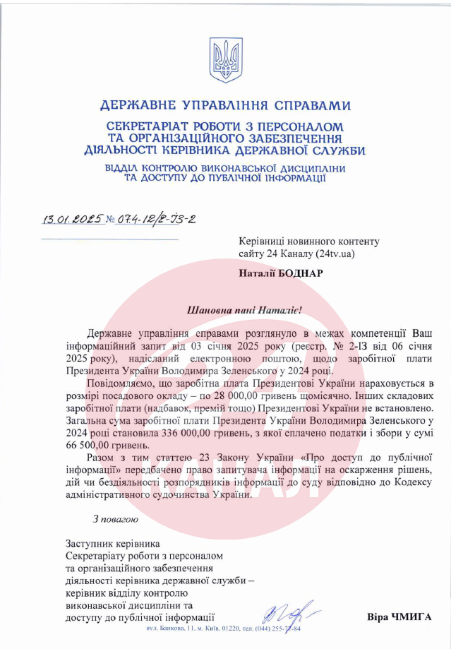 Об этом сообщает 24 Канал, получив ответ на запрос в Государственном управлении делами.