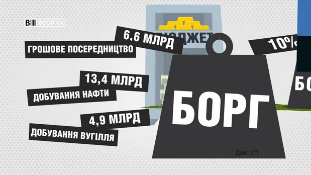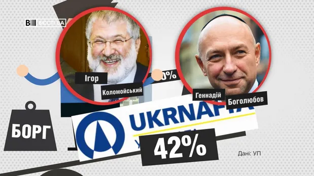 Еще в 2014 году эта сумма была почти в десять раз меньше — 9,5 миллиардов гривен. Крупнейший должник — "Укрнафта", которая не оплатила 13,2 миллиарда гривен. 42% компании принадлежат Коломойскому и Боголюбову.