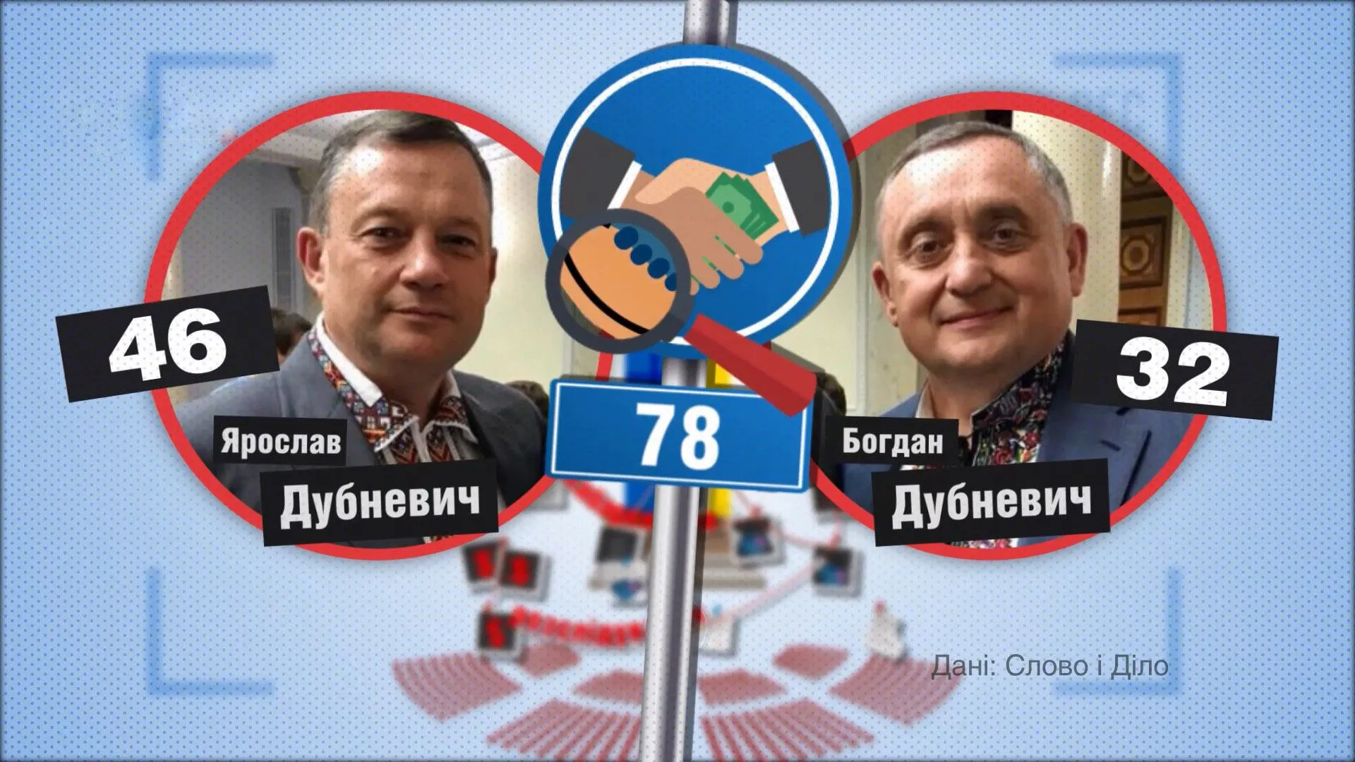 Данные расследований указывают, что безоговорочные лидеры по количеству дел – братья Дубневичи с БПП. В кровного дуэта Богдана и Ярослава на двух 78 возможных правонарушений (46 и 32 соответственно).