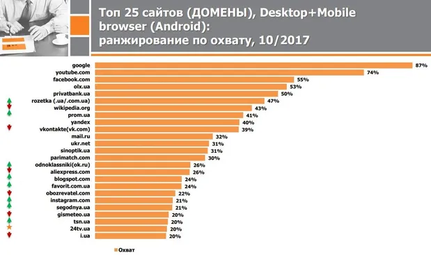 При этом российская соцсеть выпала из топ-10 по охвату в Украине. Тройка лидеров остается неизменной – Google, YouTube и Facebook.