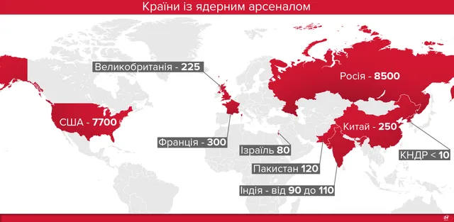 Таким образом, согласно ICAN, всего в мире накоплено 17300 ядерных боеприпасов.
