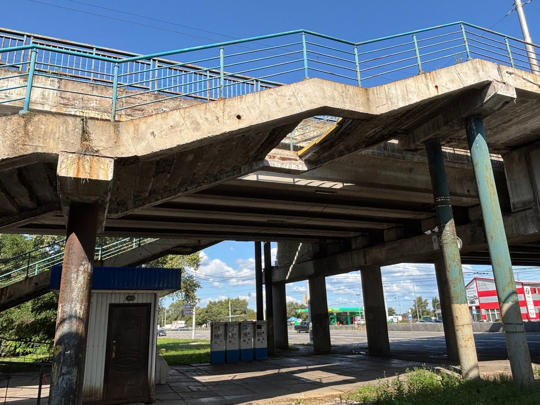 Станция остается пустой. В самом же аварийном путепроводе зияют воронки – бетонные глыбы выпали, оставив дыры под открытым небом. Картина удручающая – полуразрушенный объект посреди оживленного проспекта.
