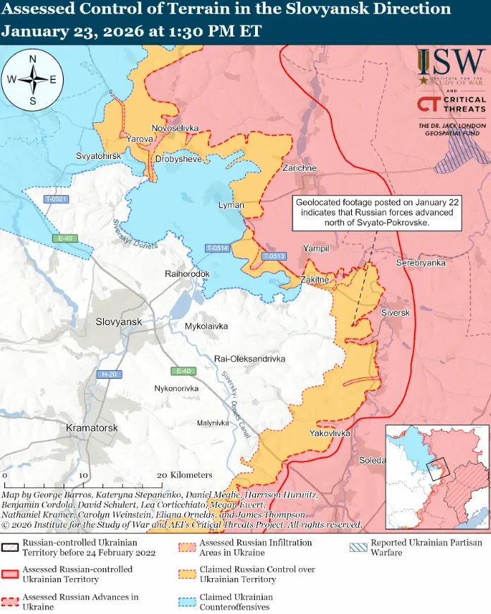 Российские войска недавно продвинулись на Славянском направлении. Геолоцированные видеокадры, опубликованные 22 января, свидетельствуют, что захватчики прошли вперед на север от Свято-Покровского (на восток от Славянска).