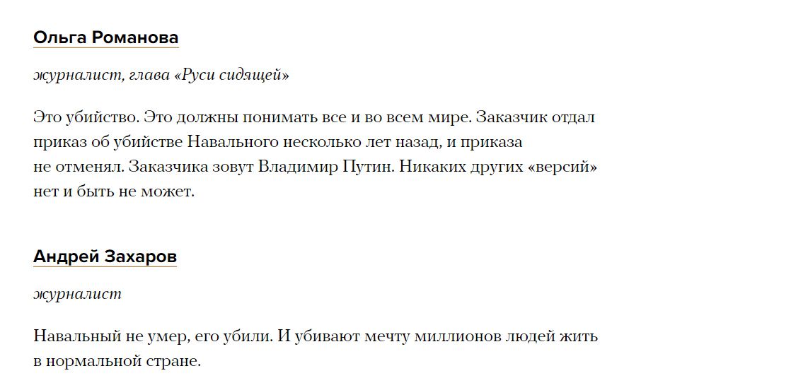 Российские политические и общественные деятели активно реагируют на новости о смерти Алексея Навального. Они отмечают, что не имеют сомнений, что это умышленное убийство. В частности, российский оппозиционер в эмиграции Михаил Ходорковский вообще выразил сомнение в том, что Навальный действительно умер.