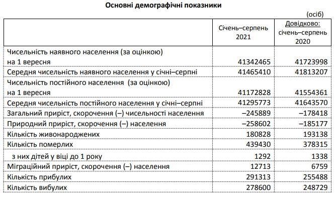 Обратите внимание! По оценке статистического ведомства, численность населения в Украине по состоянию на 1 сентября 2021 года составила 41 342 465 человек. С начала 2021 года население Украины сократилось на 245 889 человек.