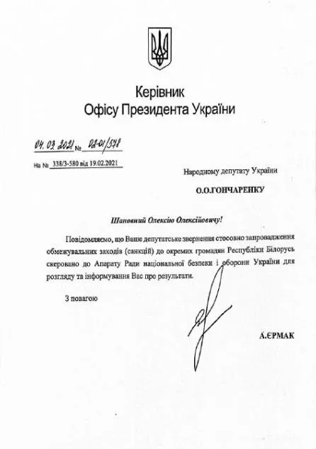 Поступил ответ от главы Офиса Президента о том, что мой запрос о введении санкций в отношении белорусских топ-чиновников и бизнесменов, которые своими деньгами поддерживают режим Лукашенко, передан в СНБО,