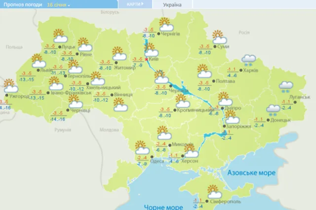 В воскресенье, 15 января, температура ночью и днем колеблется вокруг нуля - от 3 ° мороза до 2 ° тепла, днем на крайнем юге 3-6 ° тепла, в западной части и Винницкой области 5-10 °.