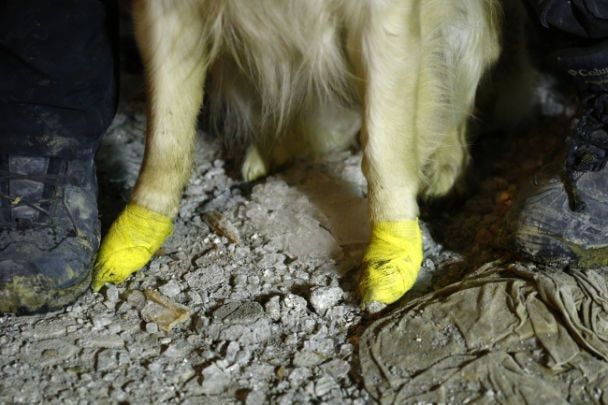 Во время поисково-спасательных работ на территории разрушенных во время землетрясений домов все четыре ножки собаки пострадали. Их ранили обломки окон. Некоторые лапы пришлось даже зашивать из-за глубоких ран,