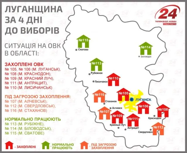 Одновременно в Луганской области их 12-ти ОИК половина находится под контролем террористов. Еще три получили от них предупреждение о захвате.