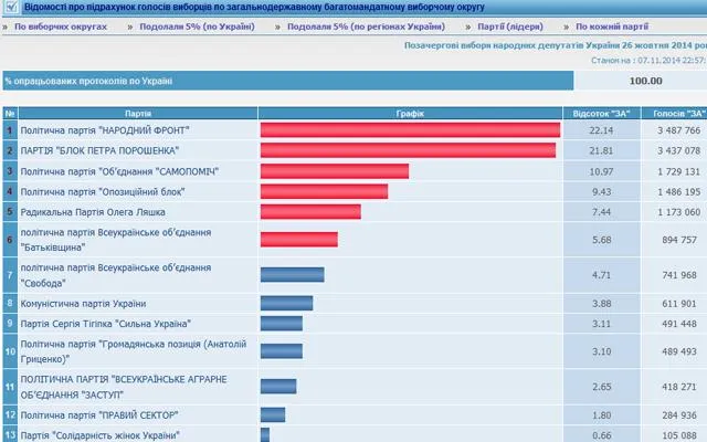 По данным ЦИК, "Народный фронт" набрал 22,14%, "Блок Петра Порошенко" — 21,81%, "Самопомич" — 10,97%, "Оппозиционный блок" — 9,43%, Радикальная партия — 7,44%, "Батькивщина" — 5,68%.