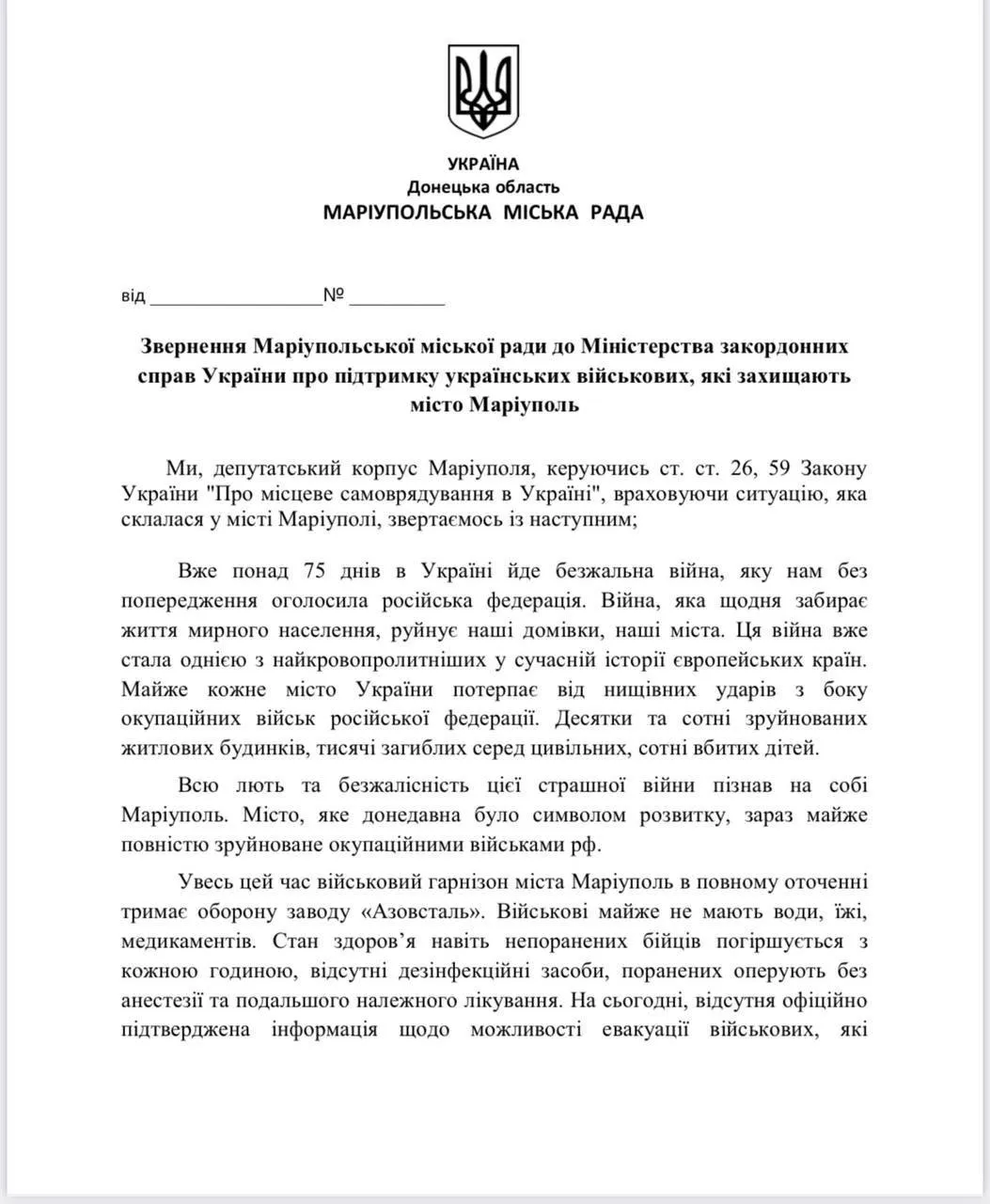 Обращение депутатов Мариупольского горсовета в МИД Украины / Фото из телеграма Петра Андрющенко