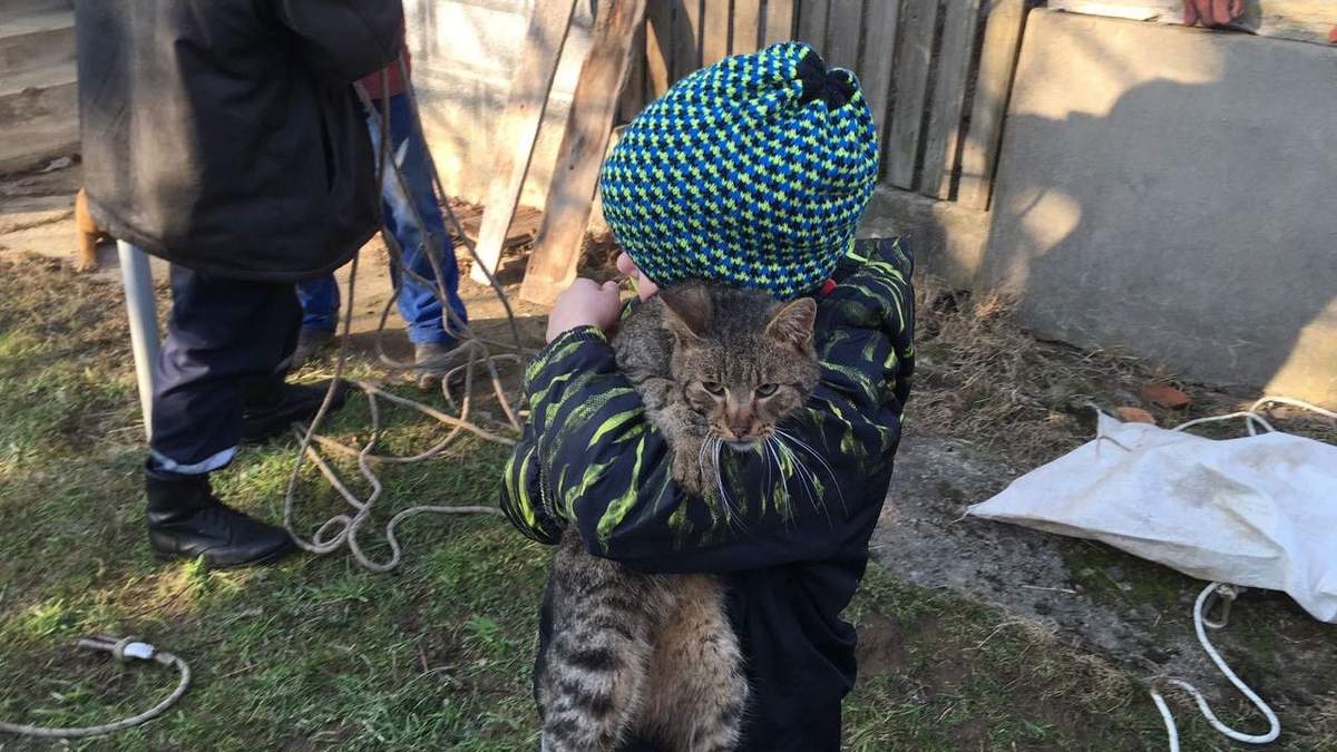 После спасения спасатели передали кота его маленьком хозяину Артему
